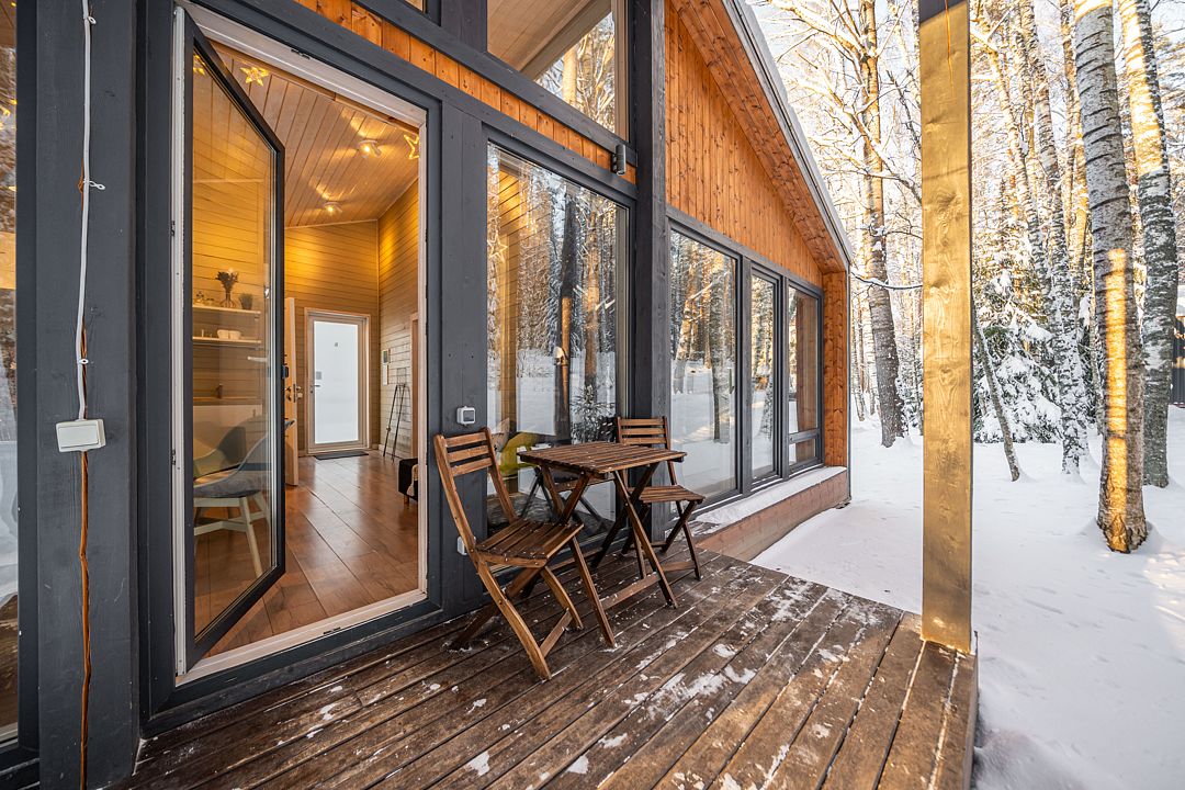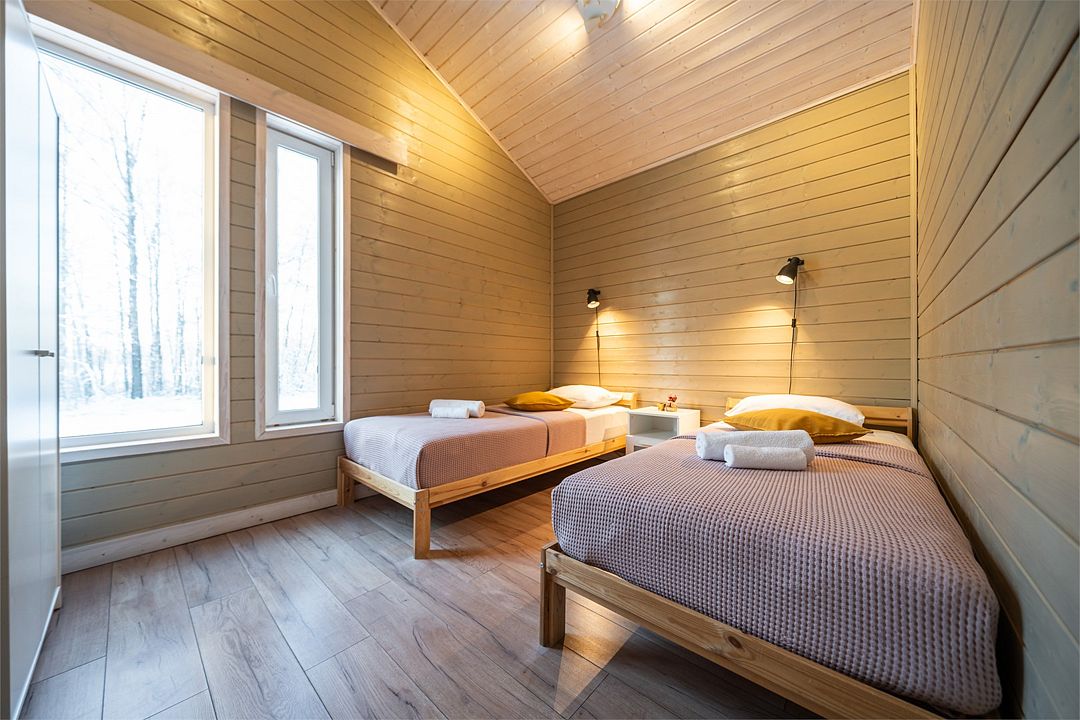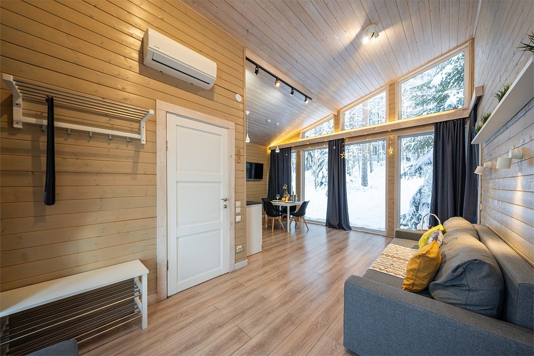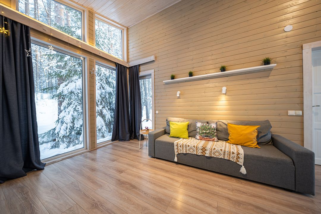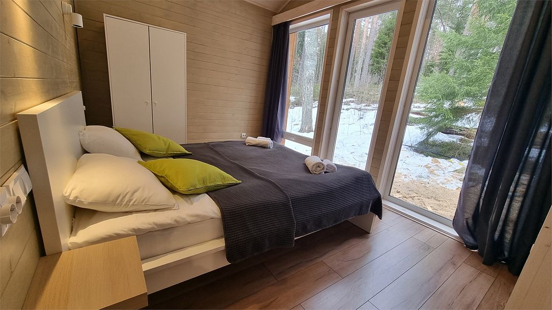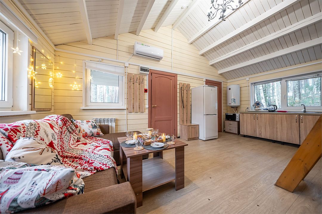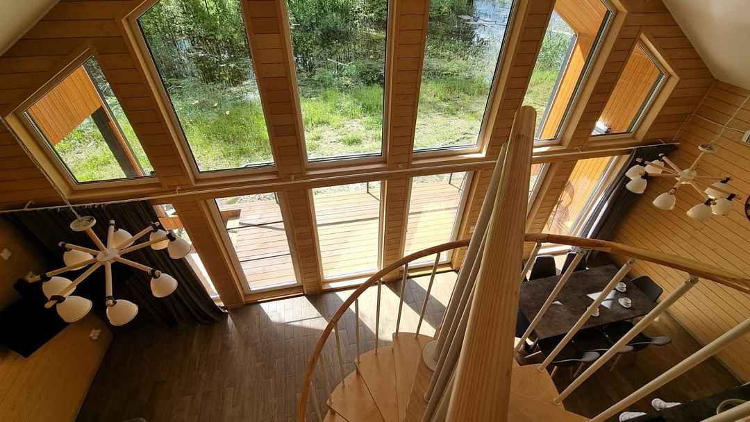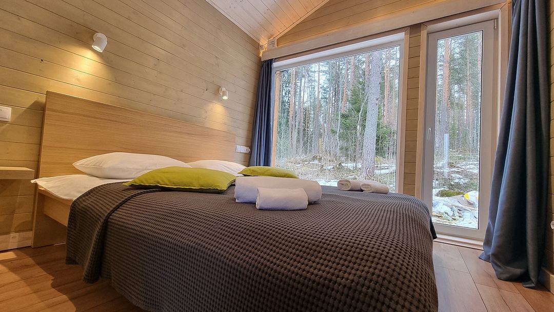 Из окон открывается прекрасный вид на о. Вуокса и лес. В 300 м находится уединенный пляж, где можно половить рыбу, искупаться и насладиться красотой природы Карельского перешейка. В интерьере домика гармонично сочетается простота с натуральными материалами в декоре.