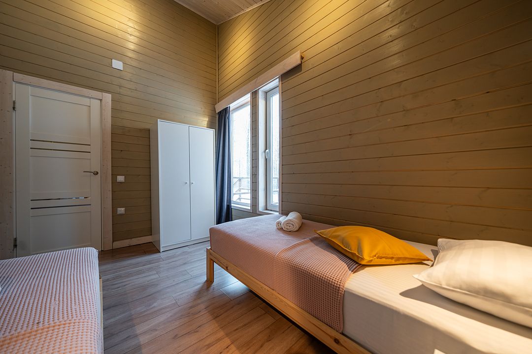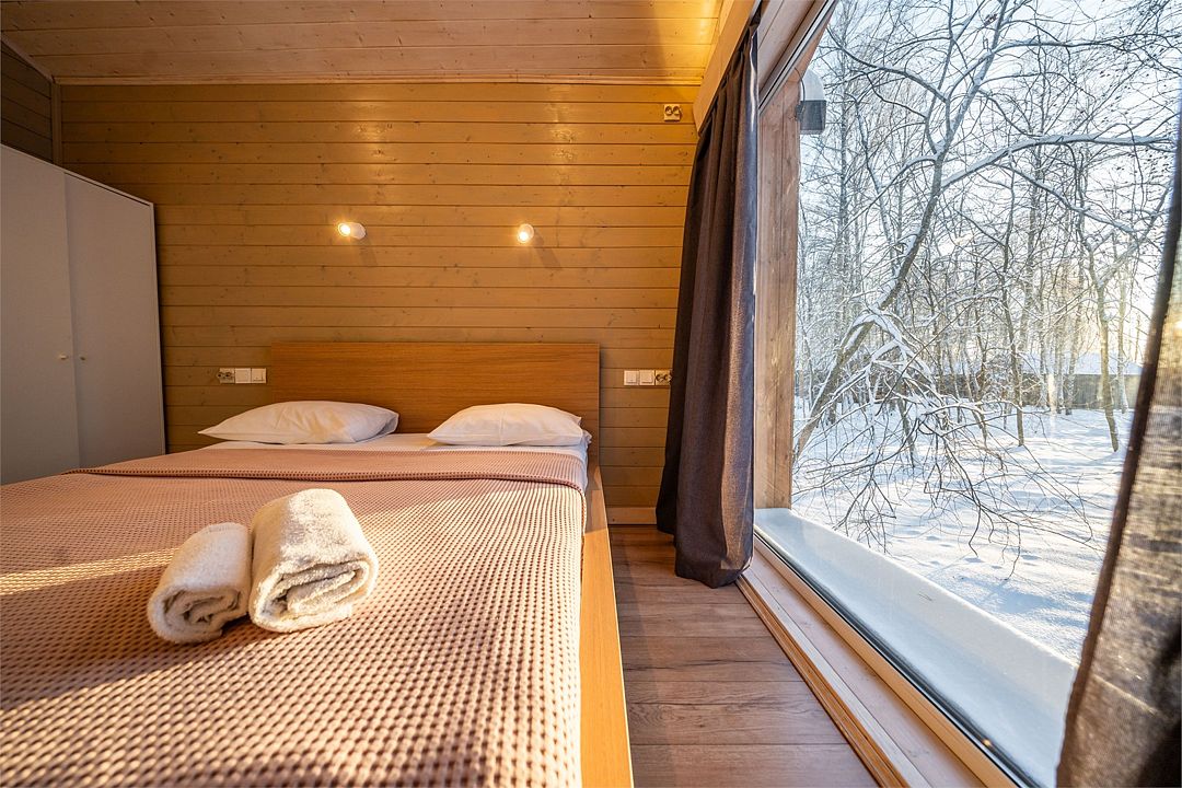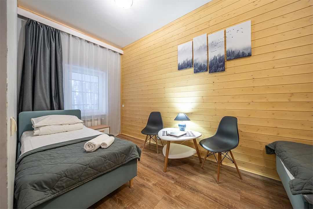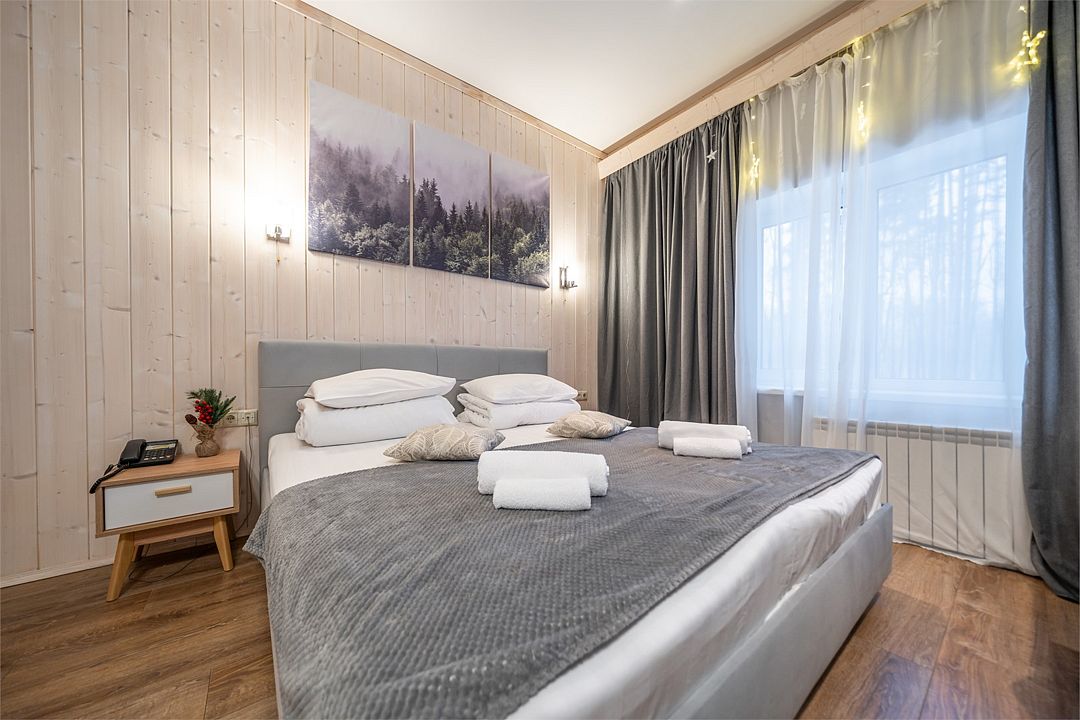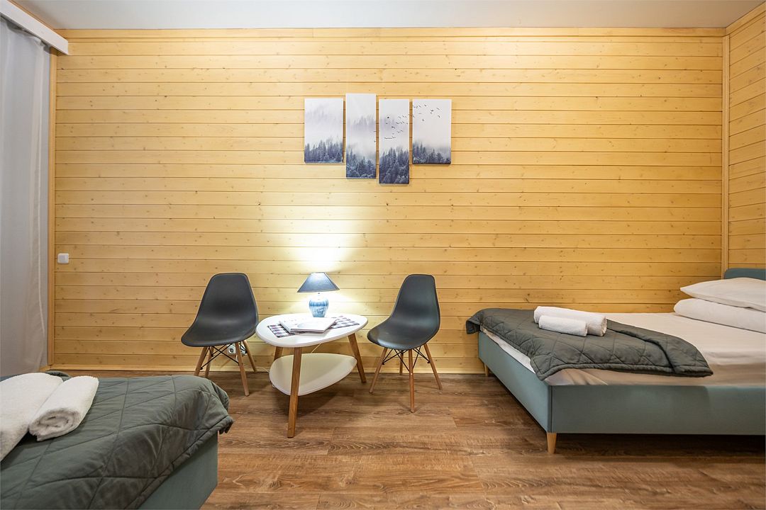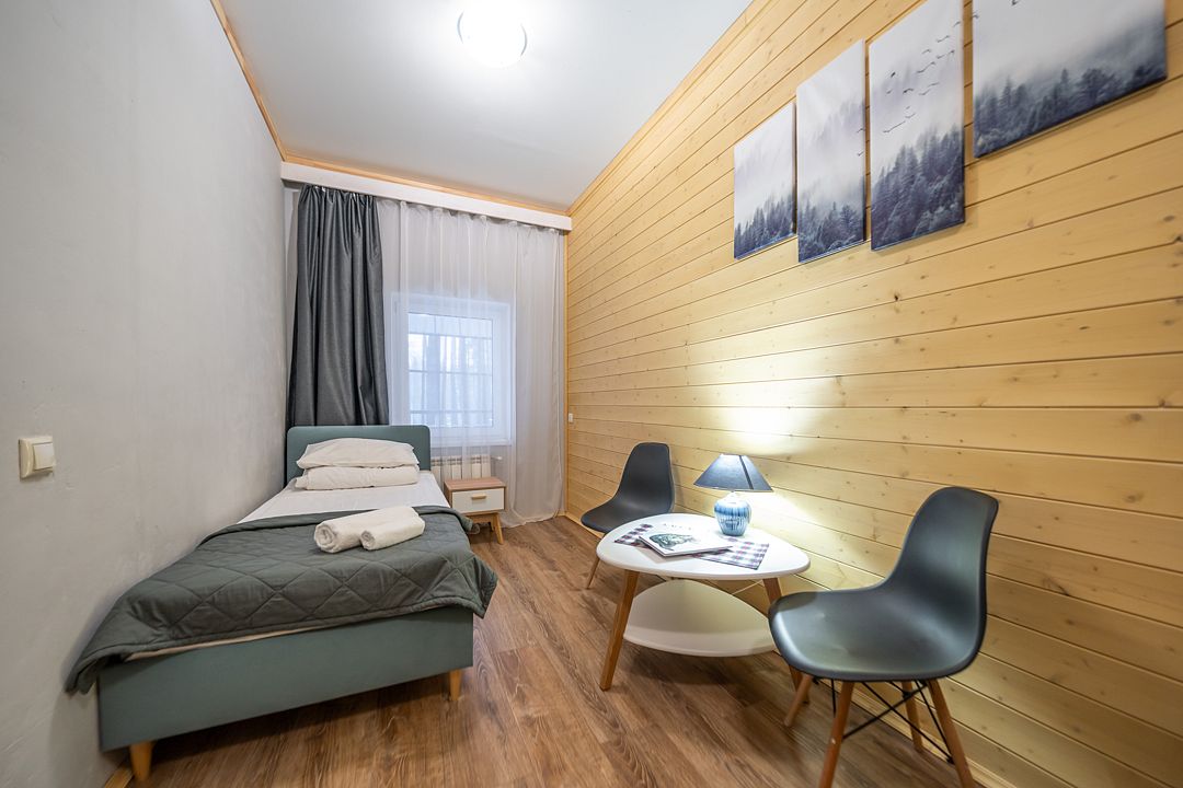 Уютный светлый номер площадью 35 кв. м, с окнами на внутренний дворик или с видом на лес, в котором одинаково комфортно может разместиться 2 взрослых или семья с детьми.