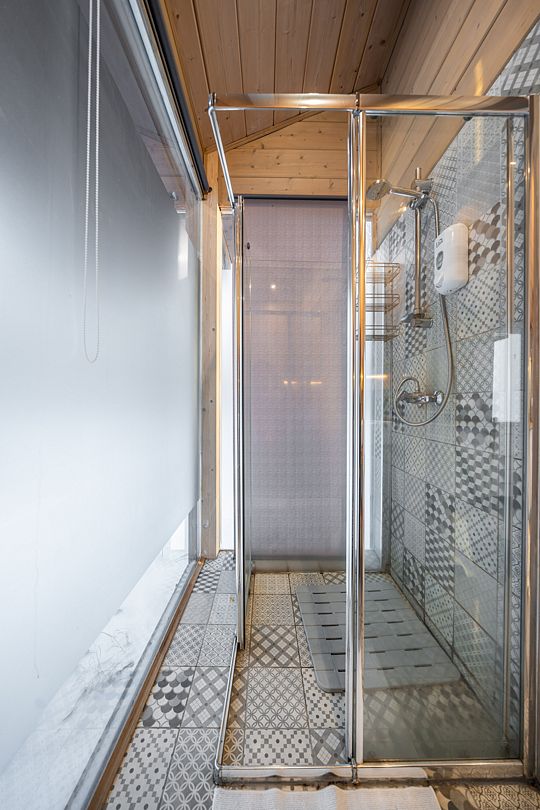 Рассчитана на 2-4 человека, рядом есть мангальная зона и душевая с небольшим бойлером. Топится дровами.