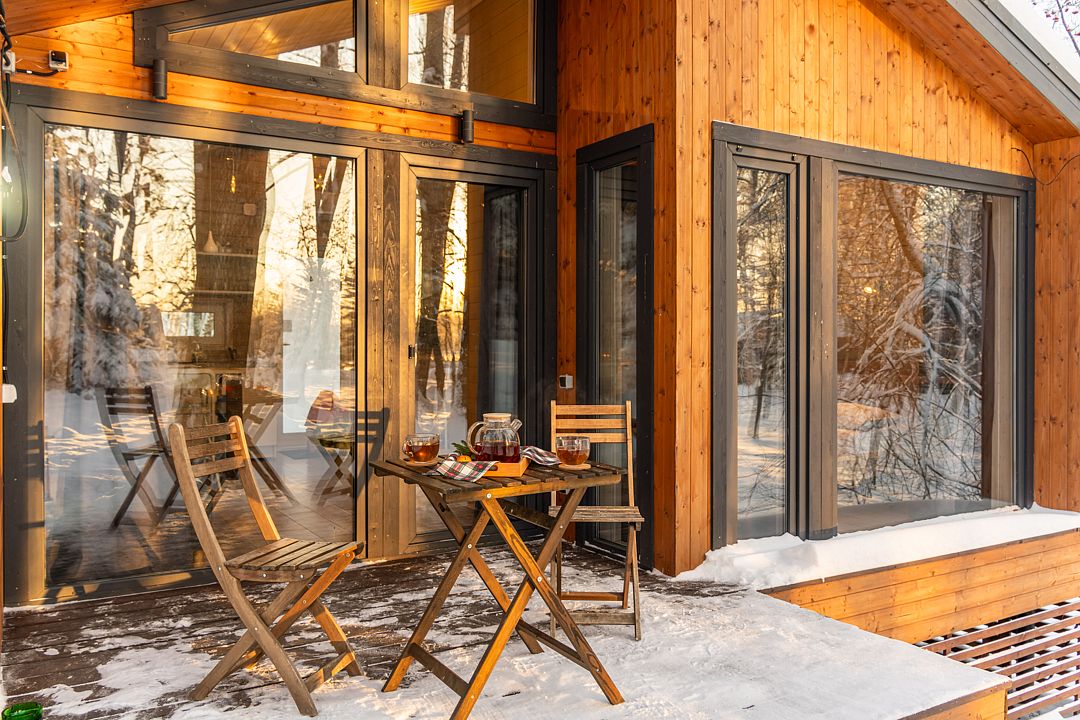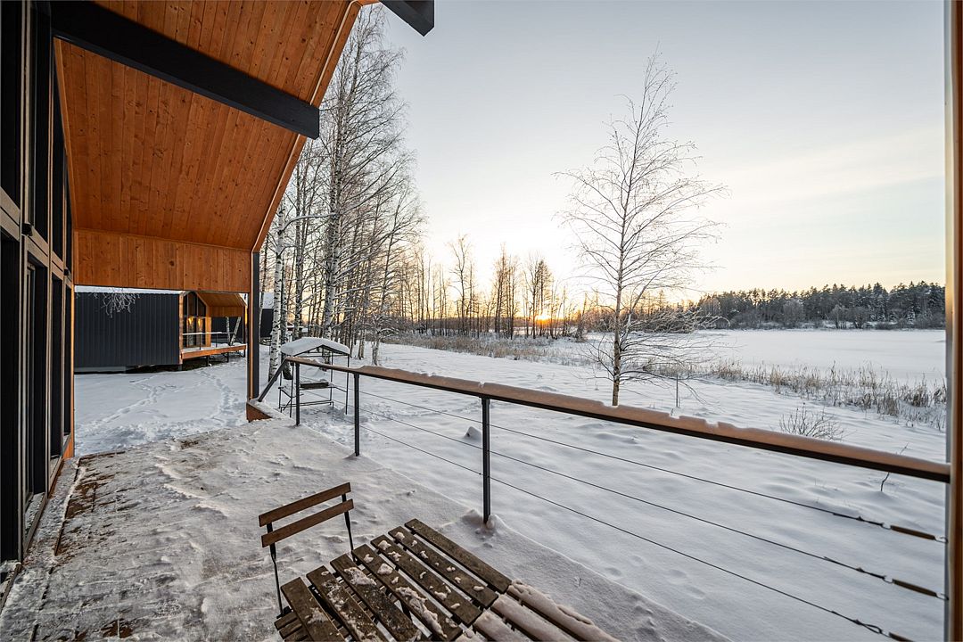 Дома на берегу Вуоксы с панорамным видом и террасой.