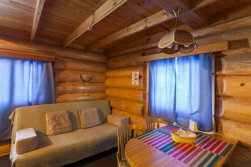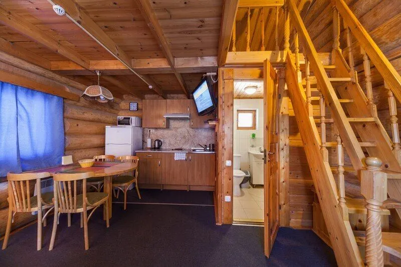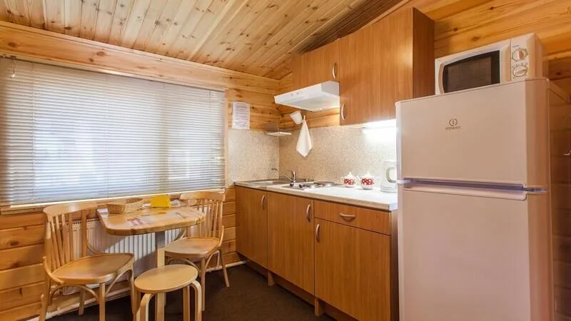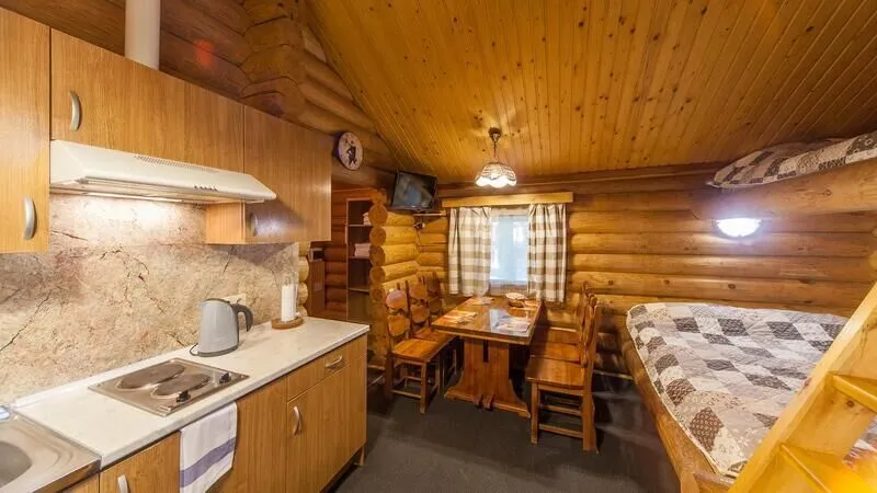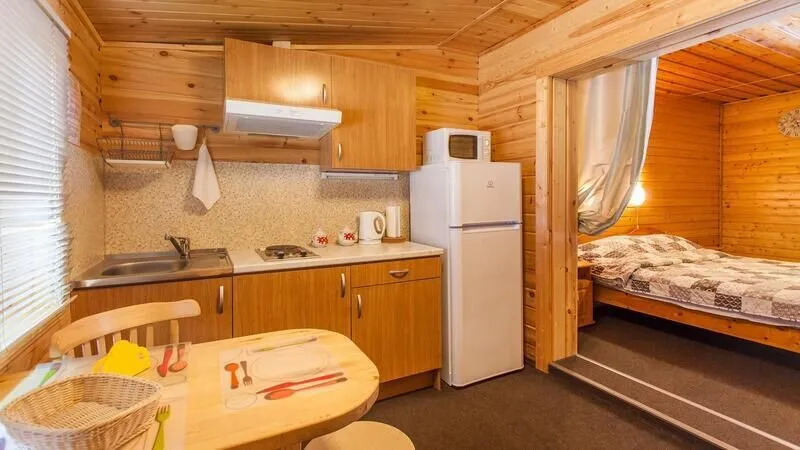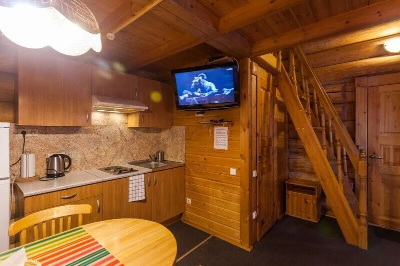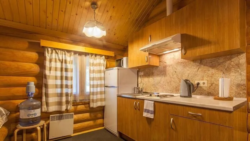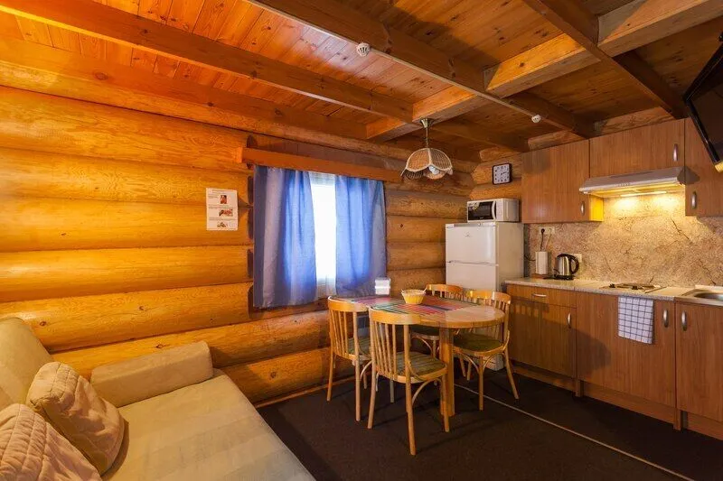- кухня-гостиная с раскладным диваном (на два места), ЖК-телевизором со спутниковым TV и DVD-проигрывателем. Кухня оборудована холодильником, микроволновкой, электроплитой, чайником и большим набором посуды для приготовления пищи и сервировки стола.