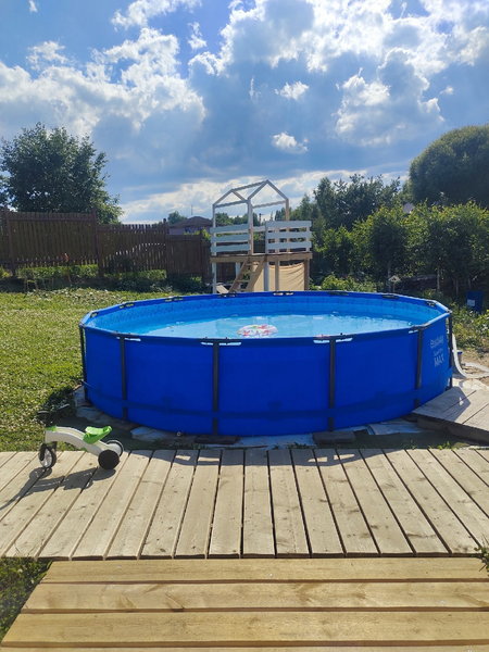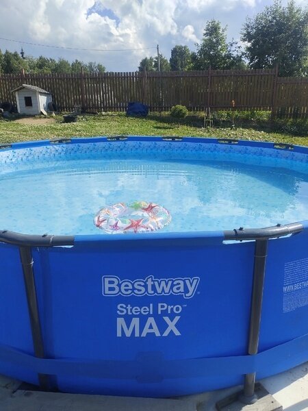В жаркие летние дни приятно освежиться в бассейне с чистой водой диаметром 4,2 м, установленном на территории. Вода в бассейне очищается специальным фильтром.