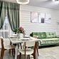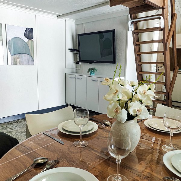 Гостиная с диваном и креслом, торшером и большим телевизором со Смарт ТВ и печью-камином. Кухня и обеденная зона со столом и сервировкой на 8 персон (посуда, столовые приборы и кухонная утварь). Санузел с душем, туалетом.