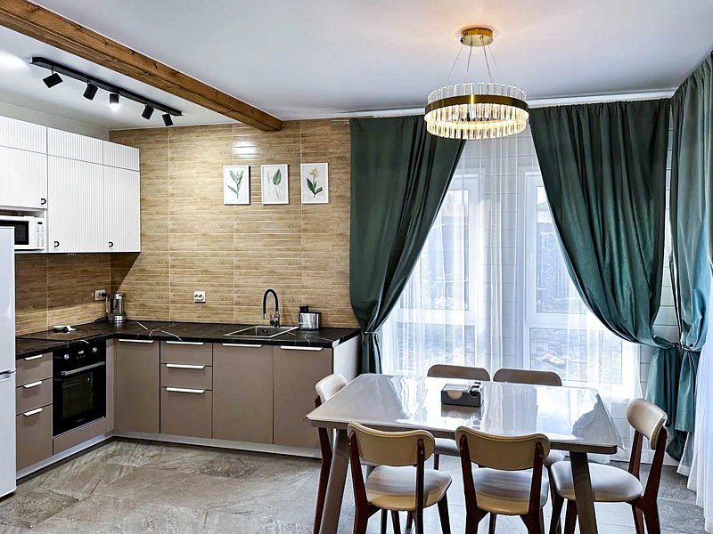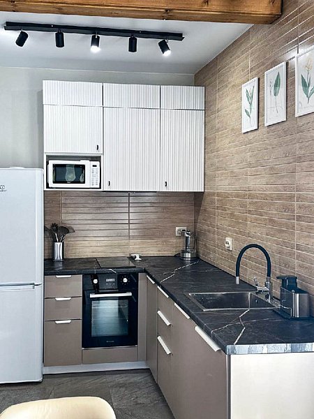 Бытовая техника: вытяжка, духовой шкаф, варочная панель, СВЧ, посудомойка, холодильник, чайник, стиральная машина, фен, телевизор, обогреватель, полотенцесушитель, утюг.