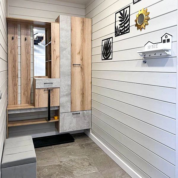 Два входа, прихожая с тумбой для обуви и шкафом.