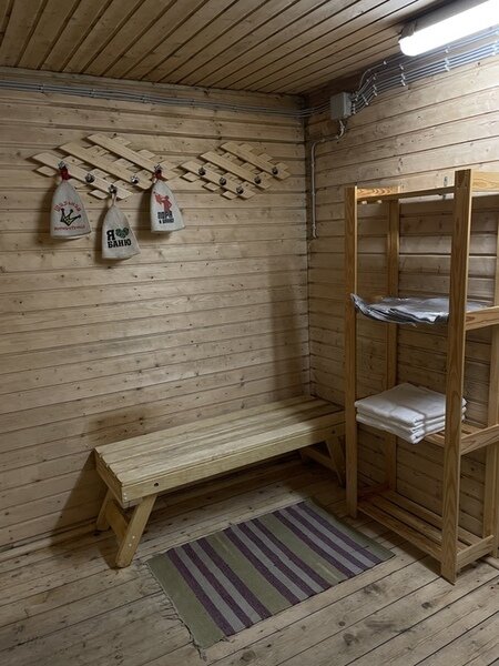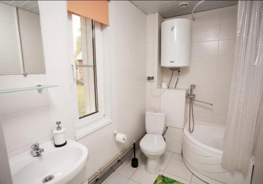 В санузле пол с подогревом, душ с занавеской, унитаз, бойлер и раковина с зеркалом — это небольшое зеркало единственное в доме. Туалетная бумага была приготовлена. Напор в душе шикарный. Горячей воды с избытком, при мытье не надо торопиться, на всех хватает и на посуду тоже. Унитаз был немного шаткий, но не критично. Кран в раковине мега-неудобный — короткий и с плохим напором, поэтому умывались в душе — там кроме душевой насадки есть нормальный кран.
