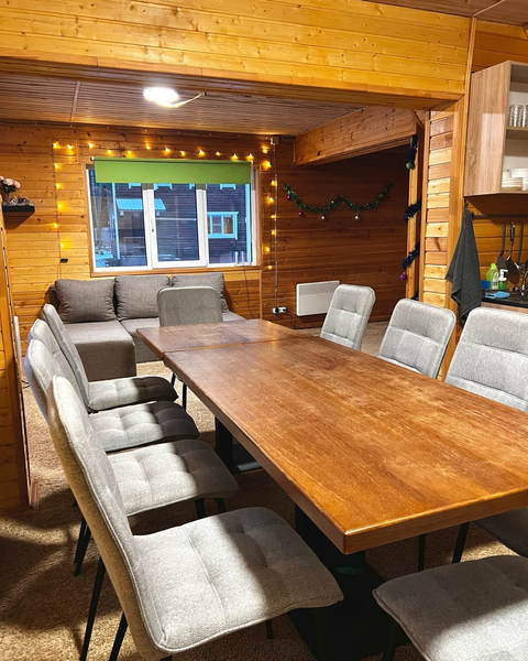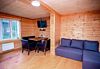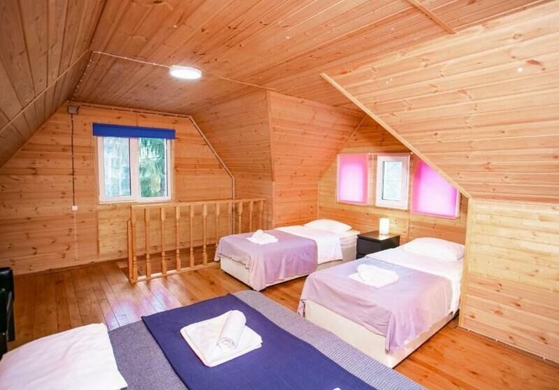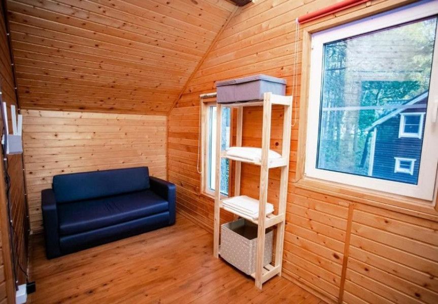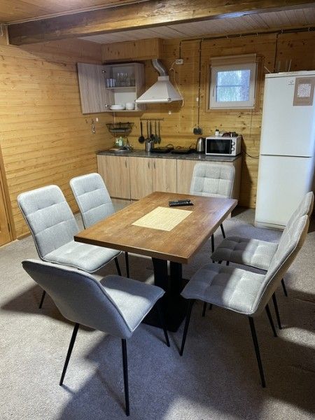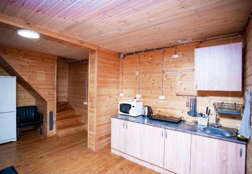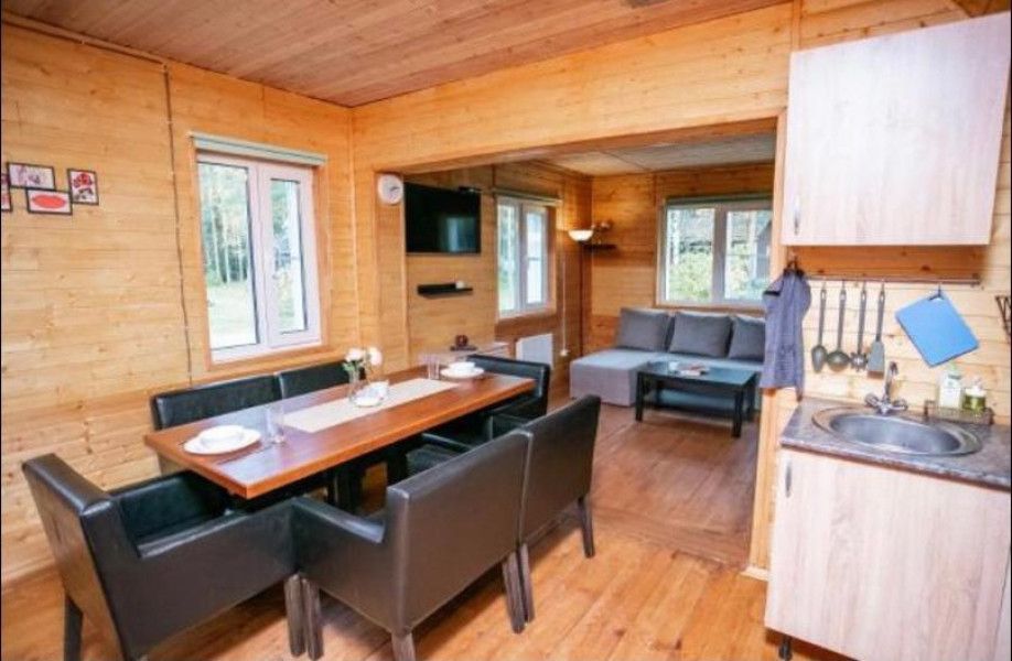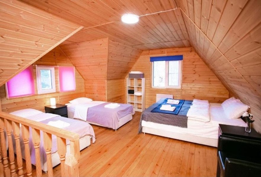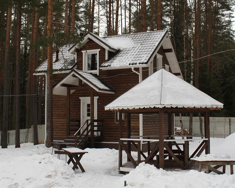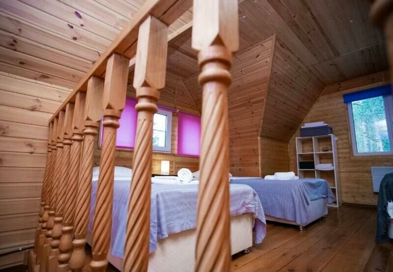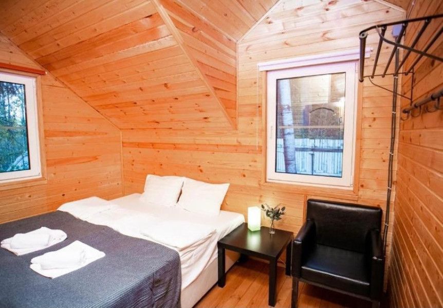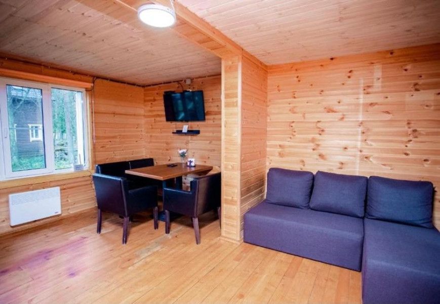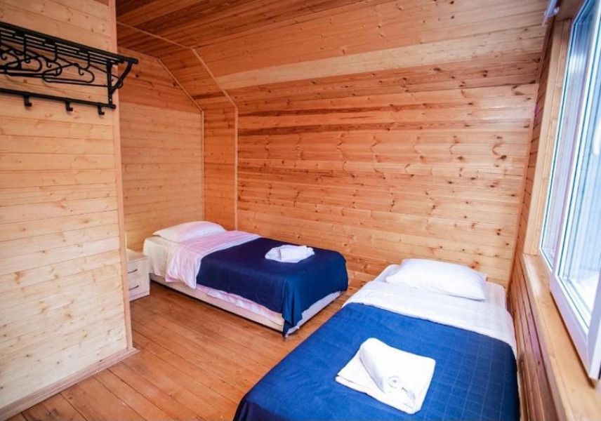 На территории базы представлены 6–местные и 10–местные коттеджи. В каждом доме имеются оснащенные бытовыми принадлежностями кухни, спальные места. Санузел и коридор с теплым полом. Также есть Wi–Fi и ТВ.