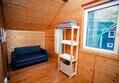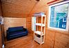 Домик двухэтажный, внизу санузел и кухня-гостиная, наверху две спальни. Между ними довольно крутая полувинтовая деревянная лестница. С маленьким ребенком я бы точно не рискнула жить с такой — я и сама один раз там в носках умудрилась проехаться по ступенькам. Ну и ночью в туалет — спускаешься-поднимаешься. Плюс в том, что свет на лестнице можно включить как внизу, так и наверху.