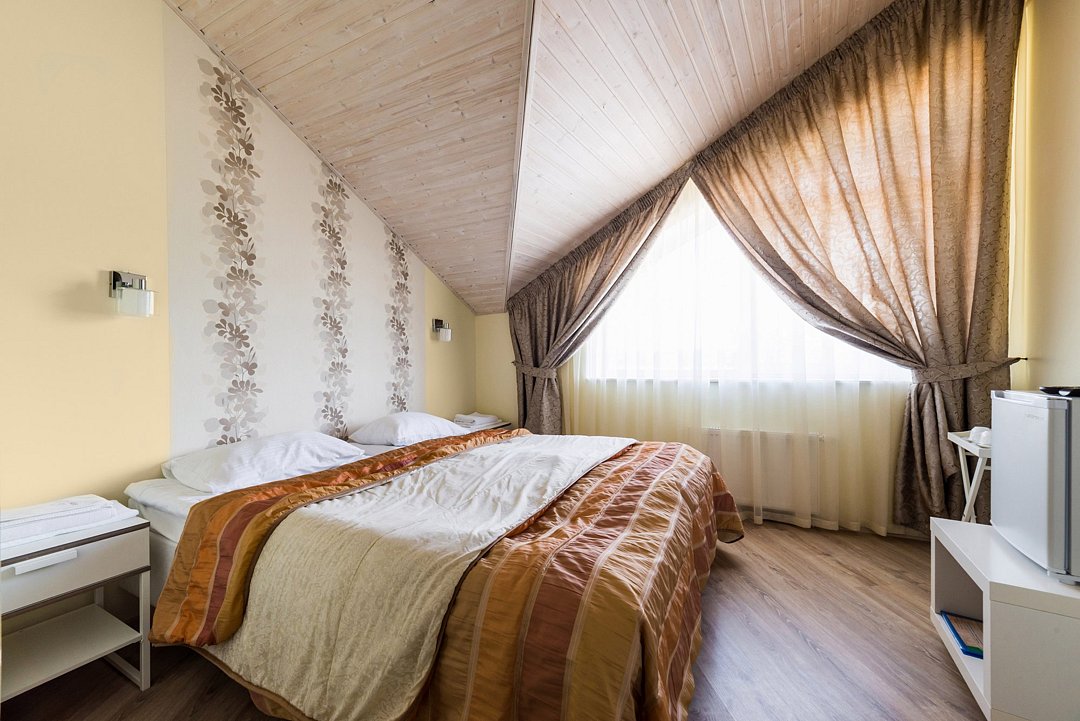Номер прекрасно подойдёт для отдыха вдвоём. Персиковые, желтые, оранжевые оттенки интерьера придают номерам уют и теплоту, располагают к хорошему отдыху. Очаровательные мансардные окна — изюминка номеров. Номера расположены на втором этаже административного комплекса.