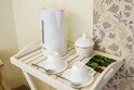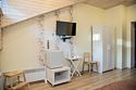Комфортабельные двухместные номера выполнены в теплых пастельных тонах, которые создают уютную домашнюю атмосферу и располагающую к отдыху обстановку. Номера расположены на втором этаже административного комплекса.