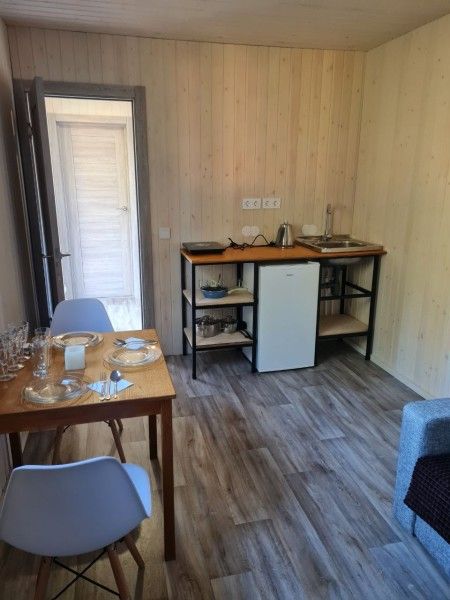 двуспальная кровать, кхонный уголок, электричество, в отдельном здании в общем пользовании с/у, душ.