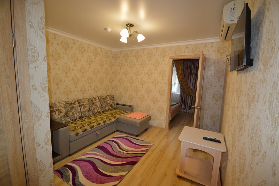 Гостиная-студия: оборудованная кухня, холодильник, электрочайник, микроволновка, обеденный стол, кондиционер, телевизор, раскладной диван.