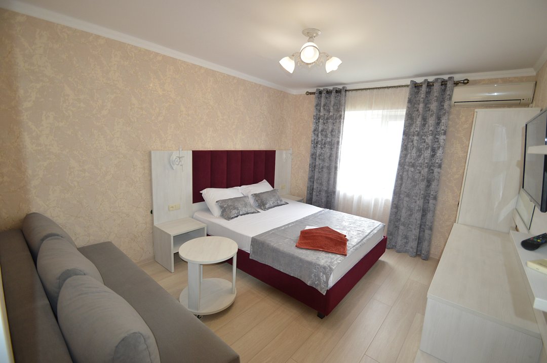 В комнате находится двуспальная кровать, раскладной диван, телевизор, кондиционер, набор мебели.