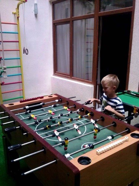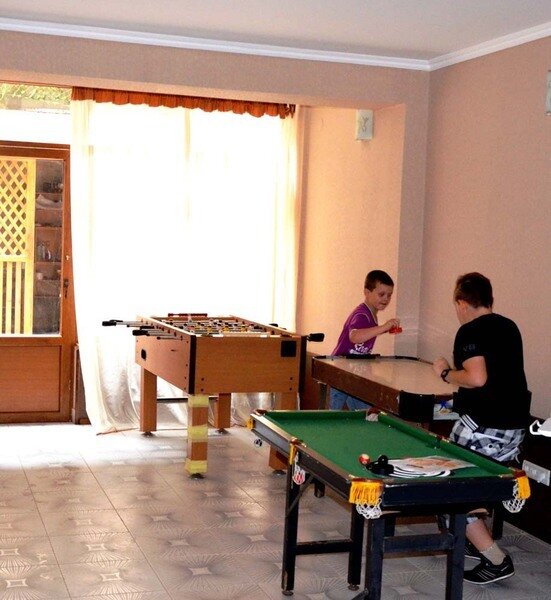 Большая комната отдыха на первом этаже, малышам - детский уголок во внутреннем дворике с игрушками, спортплощадкой, настольными играми, гладильная доска с утюгом, небольшая библиотека, большая площадка с навесом, столами, мангалами, лавочками и прекрасной панорамой на побережье, посёлок и море. Небольшая стоянка для личных авто прямо у отеля.