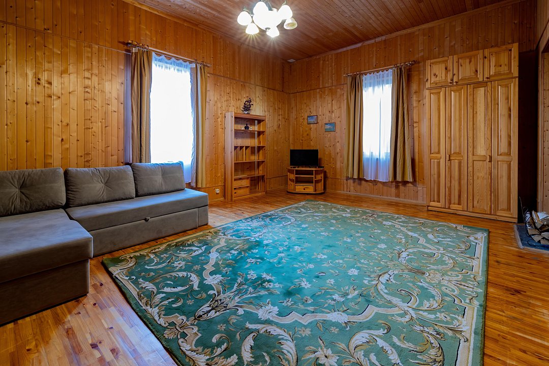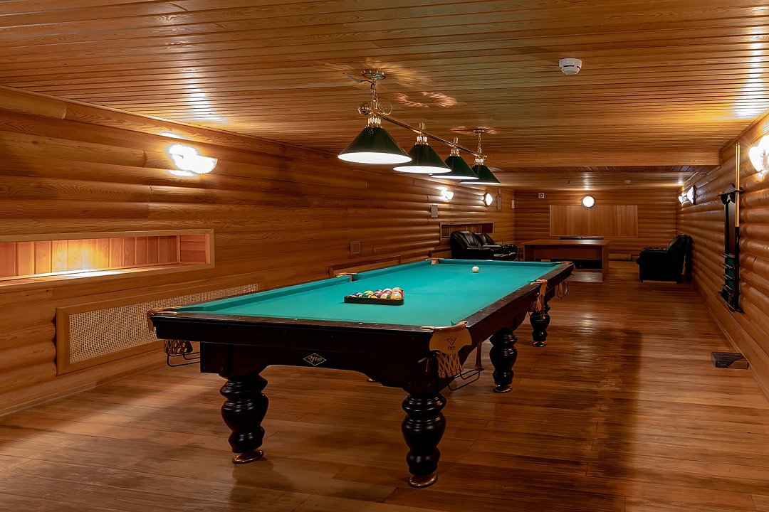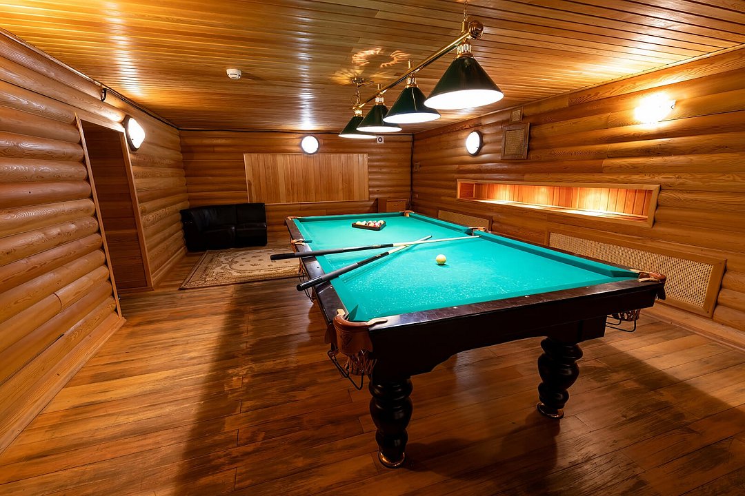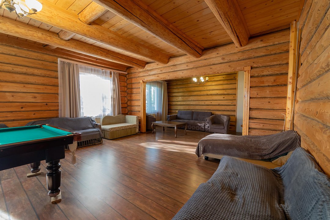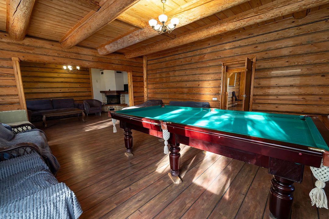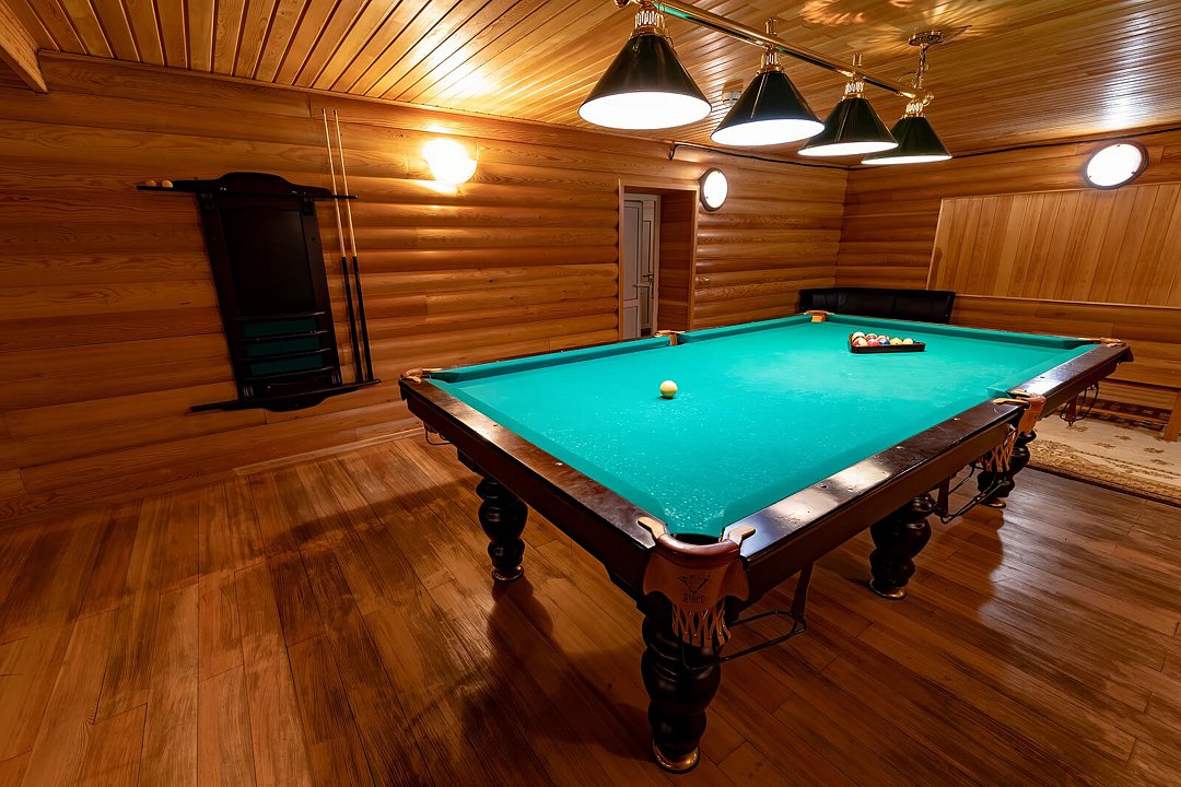 В распоряжении гостей 5 спален, 5 санузлов, большая гостиная комната, столовая зона, собственная баня на дровах, бильярд, балкон, просторная веранда и вся территория, на которой расположен коттедж.