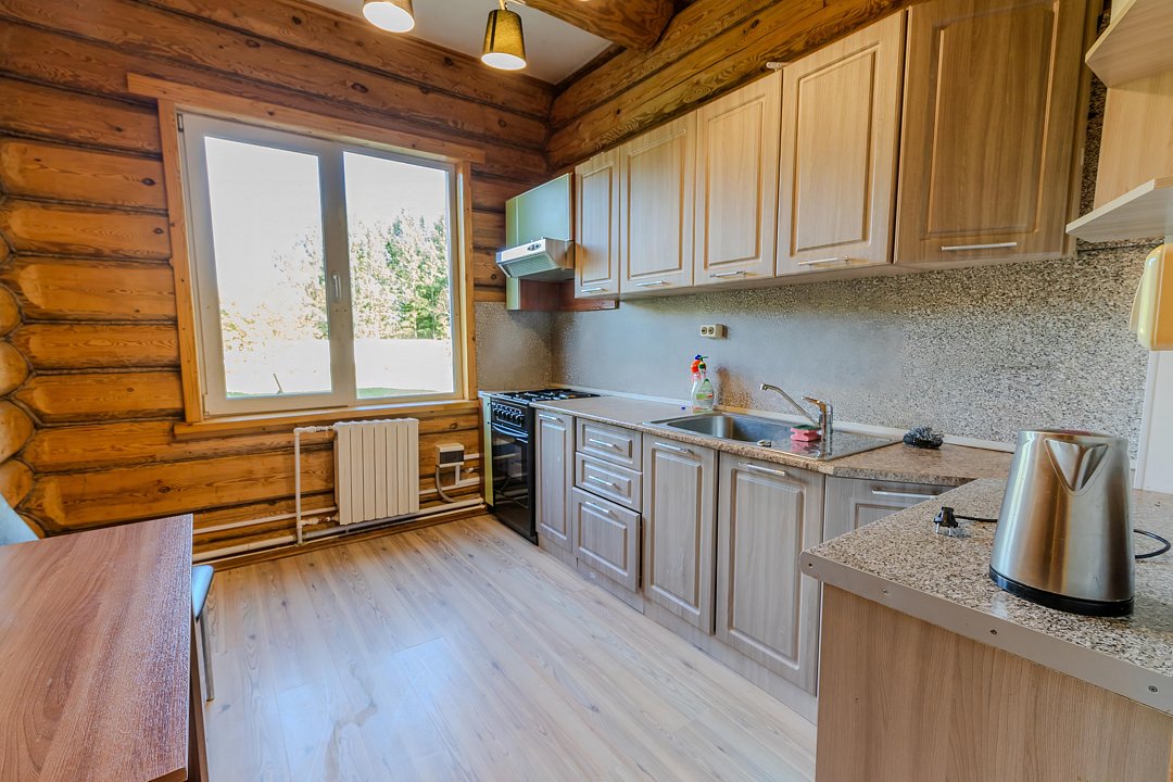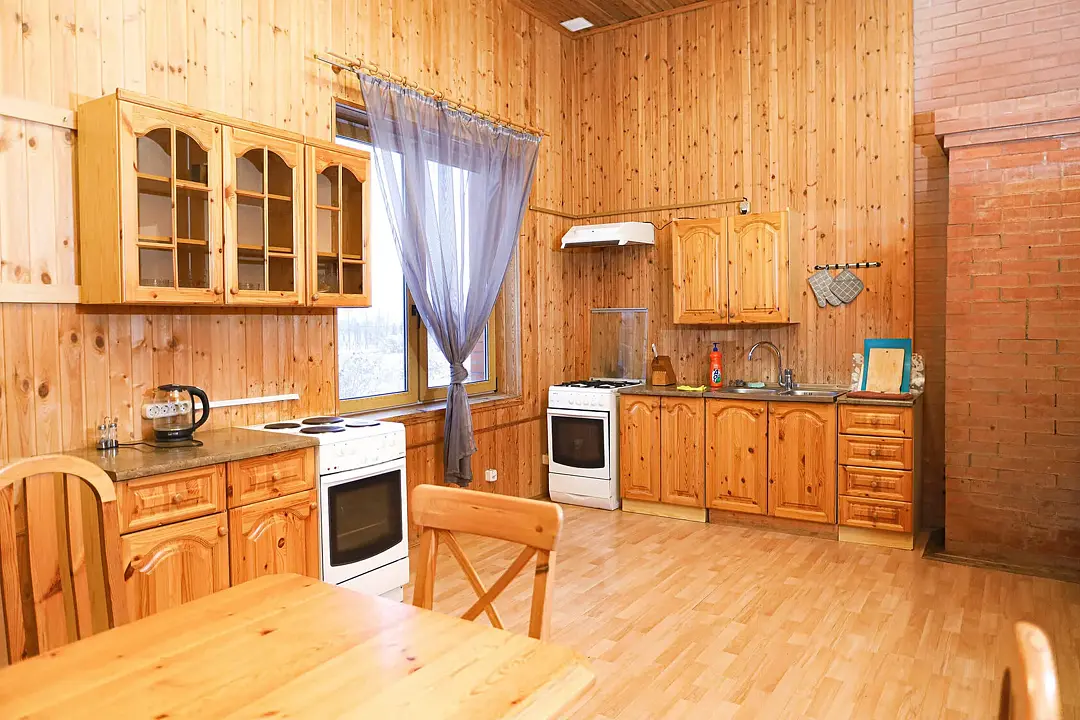 Эргономичная кухня оборудована всем необходимым для готовки и сервировки стола на большую компанию. Во дворе имеется мангальная зона.