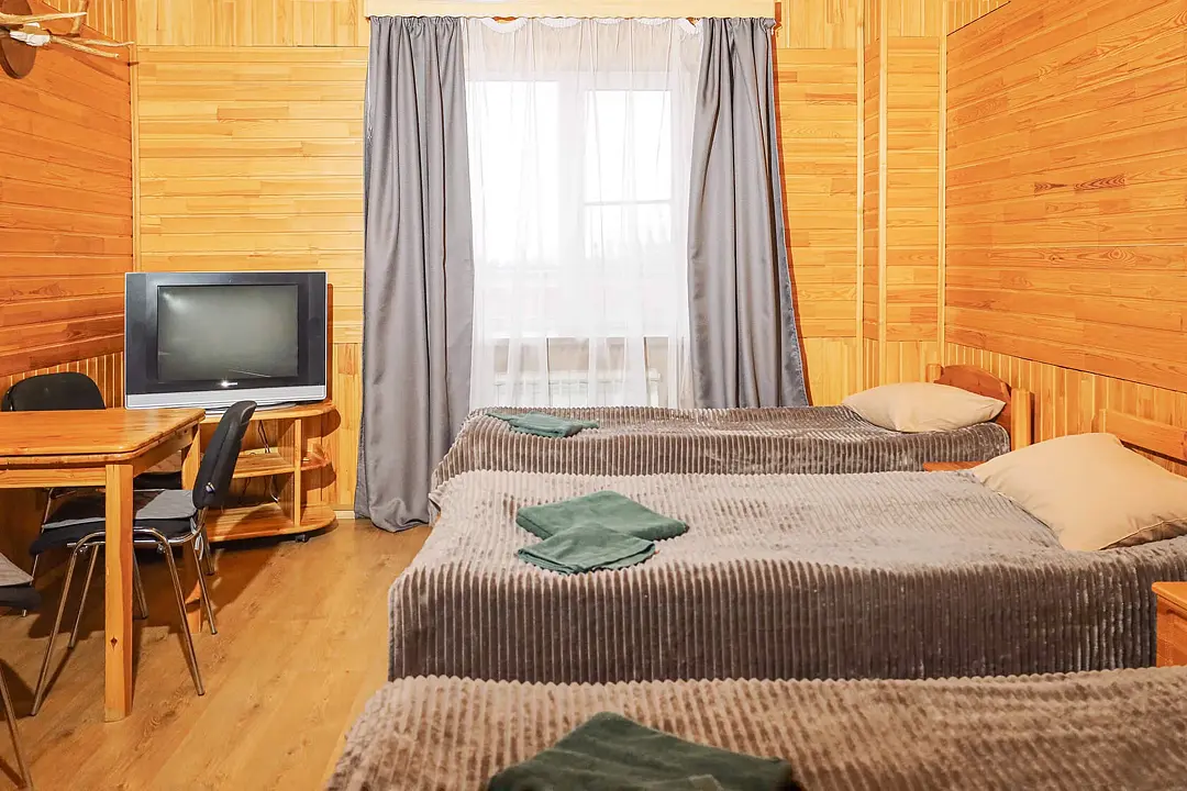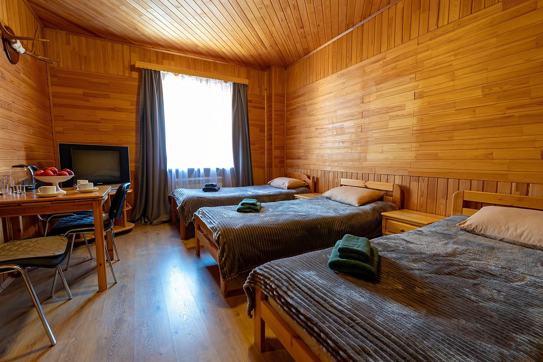 Номер оборудован 3 удобными односпальными кроватями, прикроватными тумбочками, платяным шкафом, телевизором и столиком.