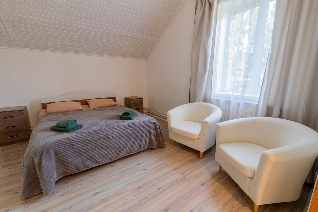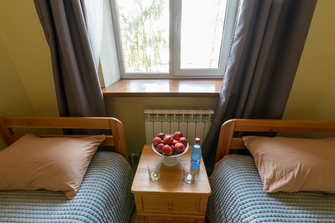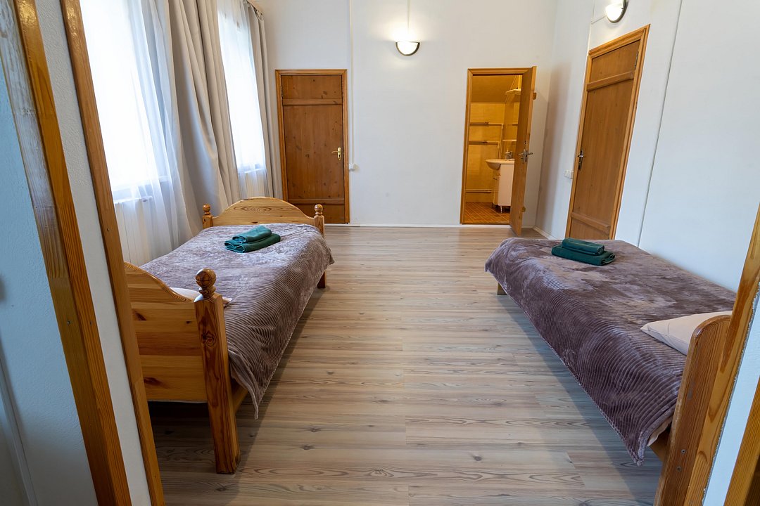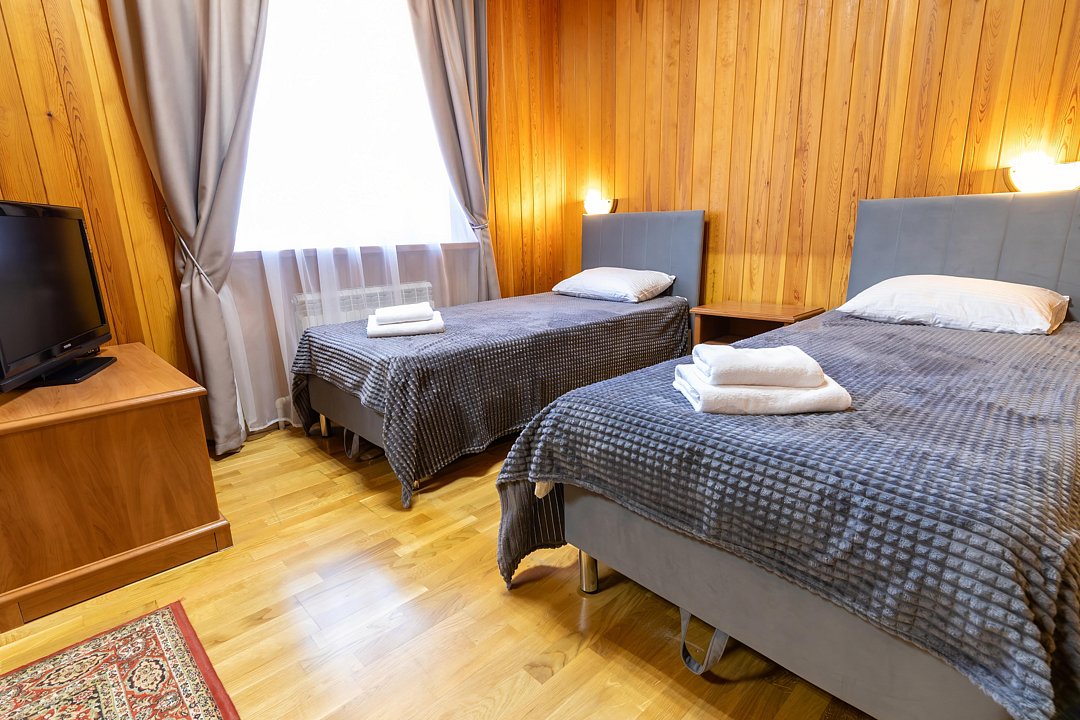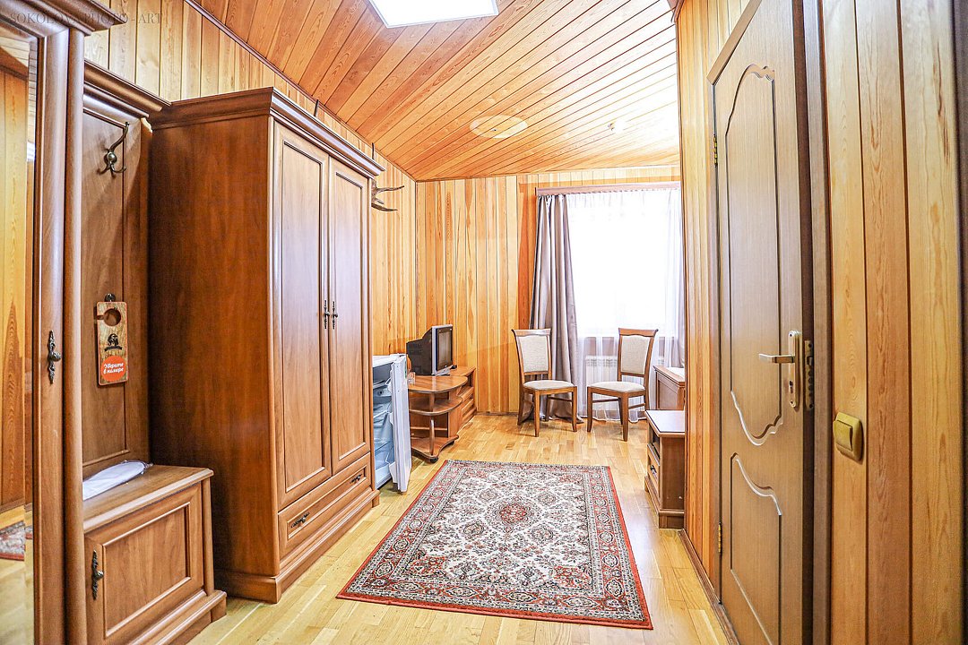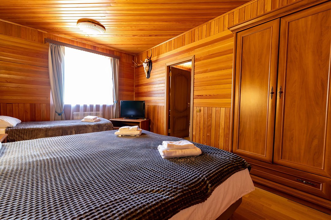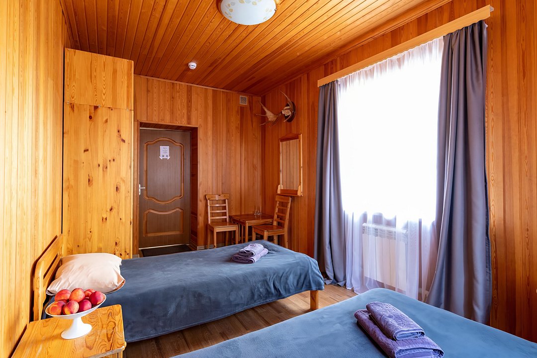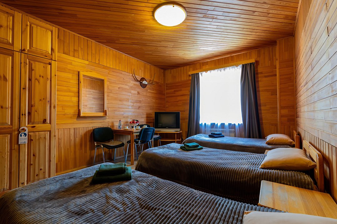 Просторный номер повышенной категории с увеличенной площадью, для комфортного проживания в компании до 3 гостей. Удобные кровати с ортопедическими матрасами, прикроватные тумбочки, собственный полноценный санузел, телевизор, холодильник.