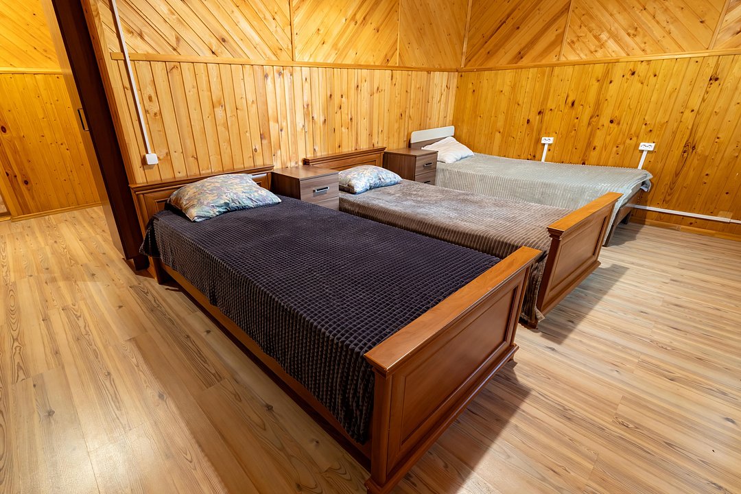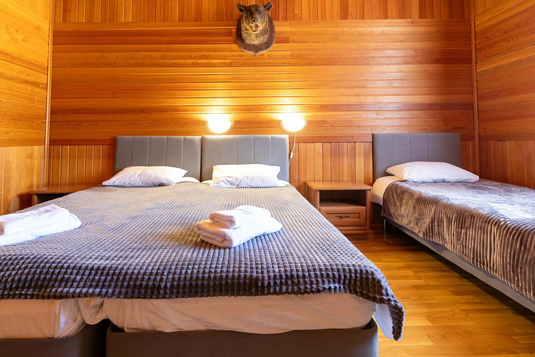 По желанию гостей можно оборудовать как 3-мя односпальными кроватями, так и одной односпальной и двуспальной стандарта king size.