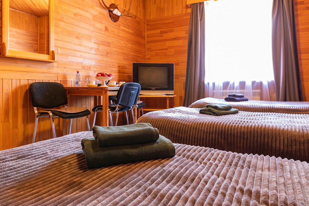 Номер оборудован удобными кроватями, прикроватными тумбочками, шкафом для одежды, телевизором, столиком.