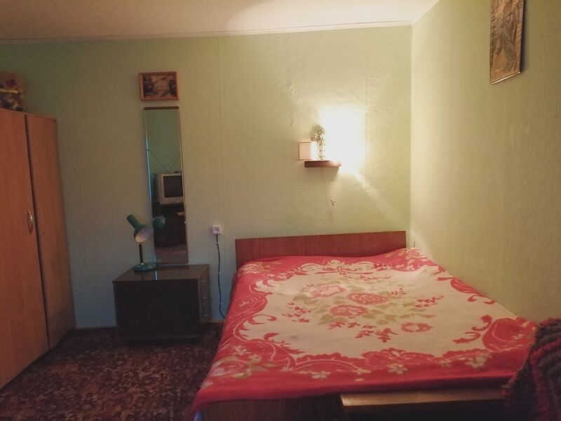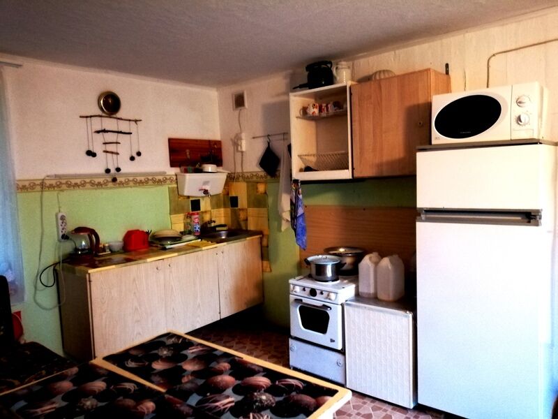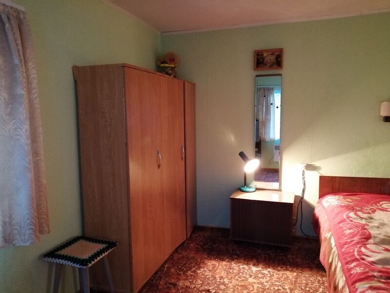 В доме две комнаты, в одной комнате двуспальная кровать, шкаф, тумбочка, кресло-кровать, телевизор. Вид из окна на лес и озеро, второе окно выходит во двор. Вторая комната- кухонная зона, диван раскладной, стол обеденный, посуда, электроплита на две конфорки, эл. чайник, большой холодильник, микроволновка, водопровод в доме (холодная вода), за стенкой баня ( предбанник, моечная и парилка) Один сеанс бани входит в стоимость проживания.