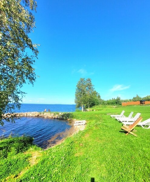 К дому пристроена открытая терраса и есть место для посиделок у костра. Дом находится у леса на своем отдельном участке 30 соток, до озера примерно 110 метров, своя первая линия — закрытая территория, сделано место для купания только для гостей дома, ставятся шезлонги, кресла кентуки, сделано три пирса для рыбалки, можно приезжать со своей лодкой и мотором, либо арендовать здесь. При необходимости выдаются ключи от гаража, где можно хранить свои рыбацкие принадлежности. В данном коттедже возможно проживание с животными за дополнительную плату.