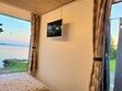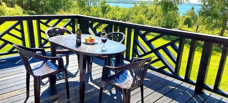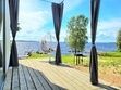 К дому пристроена частично закрытая уличная терраса, на которой стоит мебель. Дом находится на своем отдельном участке 20 соток, на горе, открывается красивый вид на озеро, до берега примерно 80 метров, своя первая линия — закрытая территория, сделано место для купания только для гостей дома, ставятся шезлонги, кресла кентуки, сделано три пирса для рыбалки, можно приезжать со своей лодкой и мотором, либо арендовать здесь. При необходимости выдаются ключи от гаража, где можно хранить свои рыбацкие принадлежности.