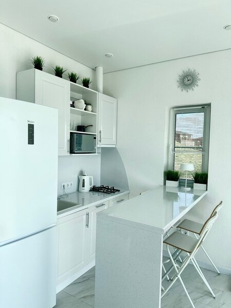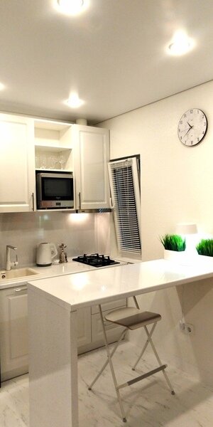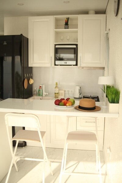 - все в одном едином пространстве кухонная, обеденная зона и зона отдыха;