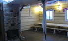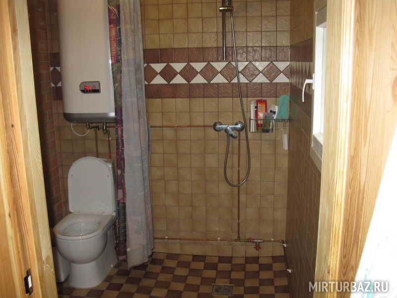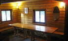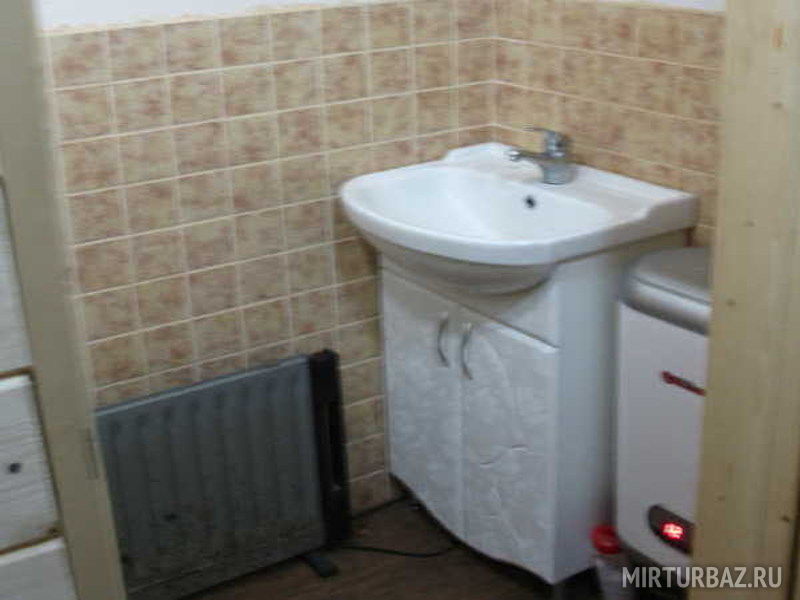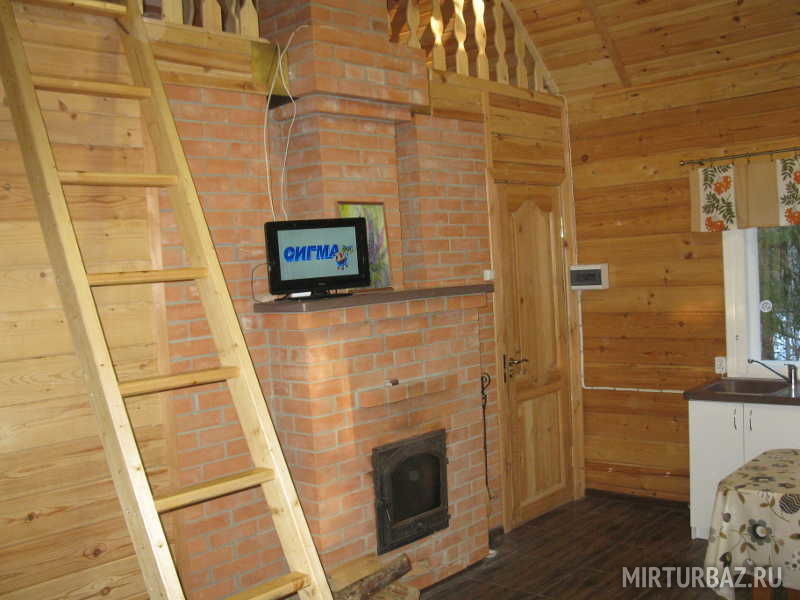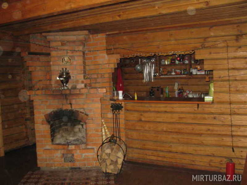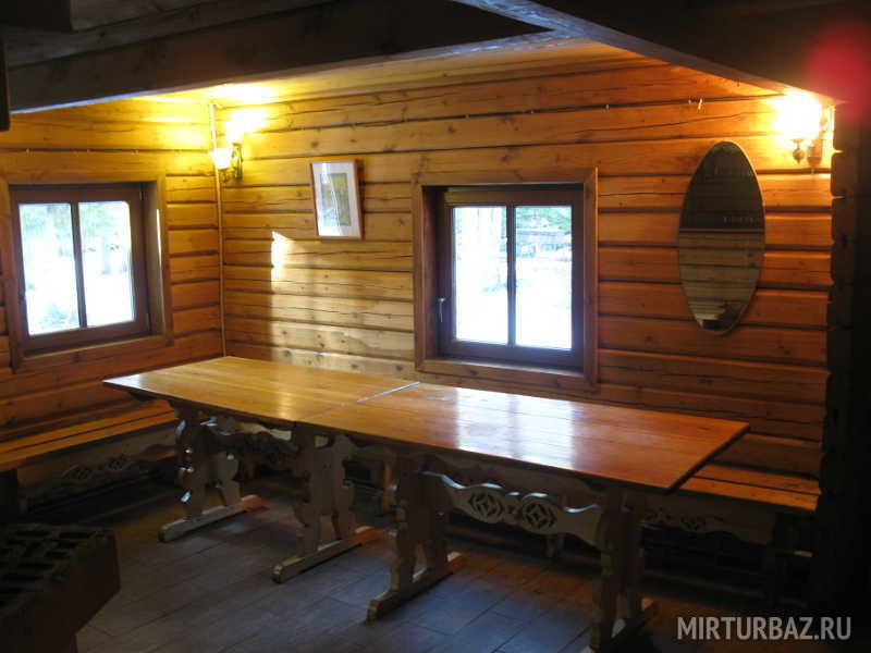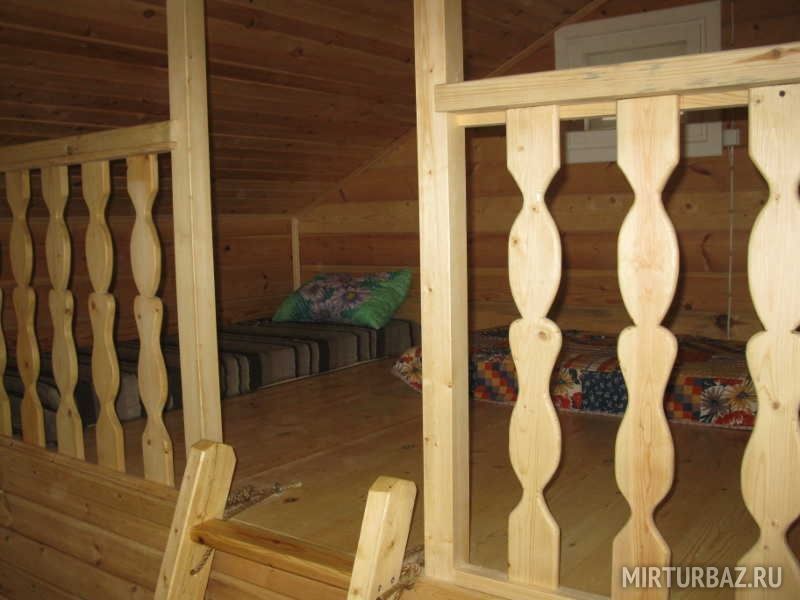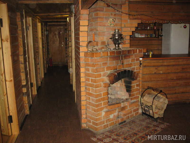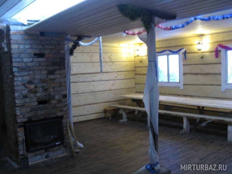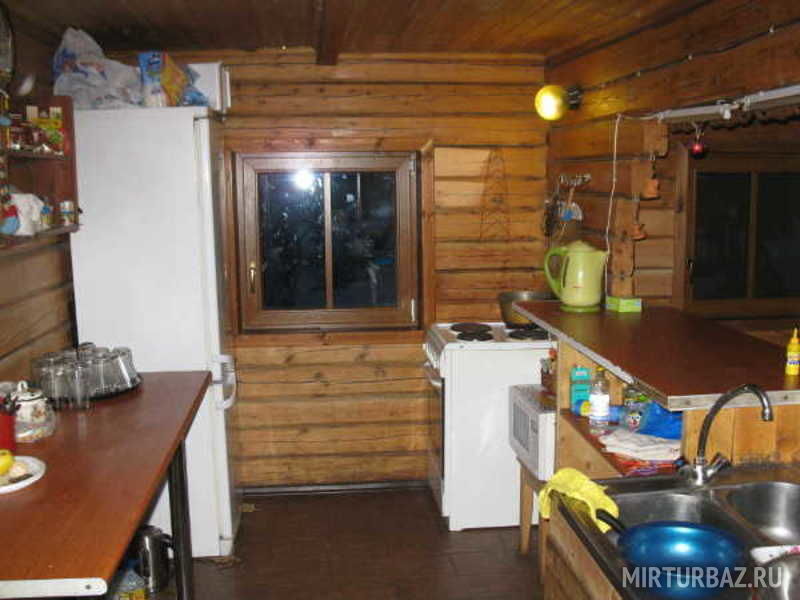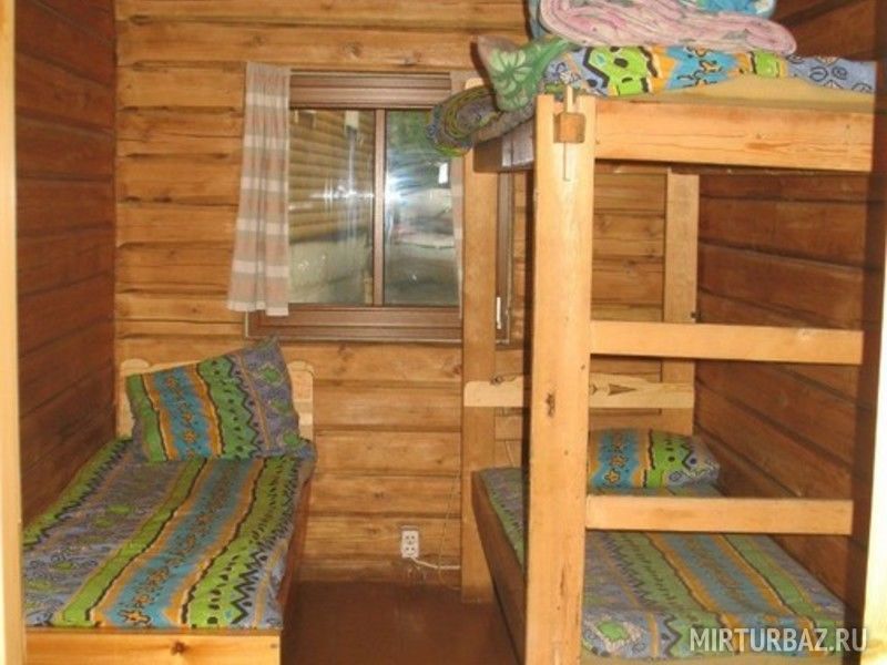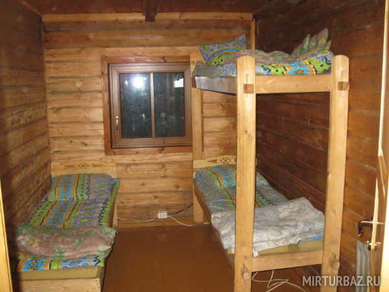 Деревянный дом. В доме 6 комнат 2.1х3.6 метра. В каждой комнате одна двухъярусная кровать и одна обычная. На этом же этаже кухня с электроплитой (холодильник, микроволновка, холодная и теплая вода) и зал столовая. Электроотопление. Туалет на улице и в цокольном этаже (проход через улицу). В цокольном этаже - банкетный зал на 30 чел.