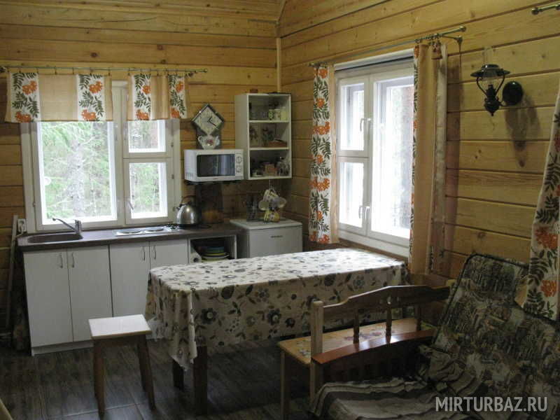 Небольшой деревянный домик. В доме отдельная спальня с двуспальной кроватью, холл (кухня-столовая), душ, туалет. Дополнительные спальные места - в полуэтаже (финские полати) и в холле - раскладной диван.