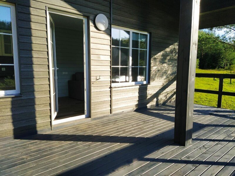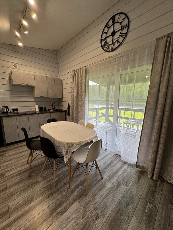 В доме есть всё для комфортного проживания: душ и фен, кухня с полным набором посуды, постельное бельё, полотенца и даже пледы для вечерних посиделок на террасе, панорамные окна с видом на реку — просто дышите и наслаждайтесь.