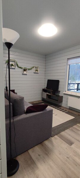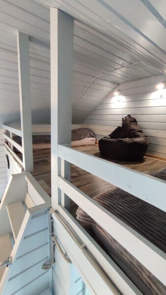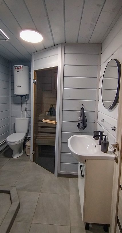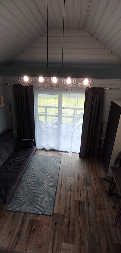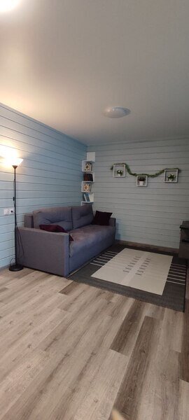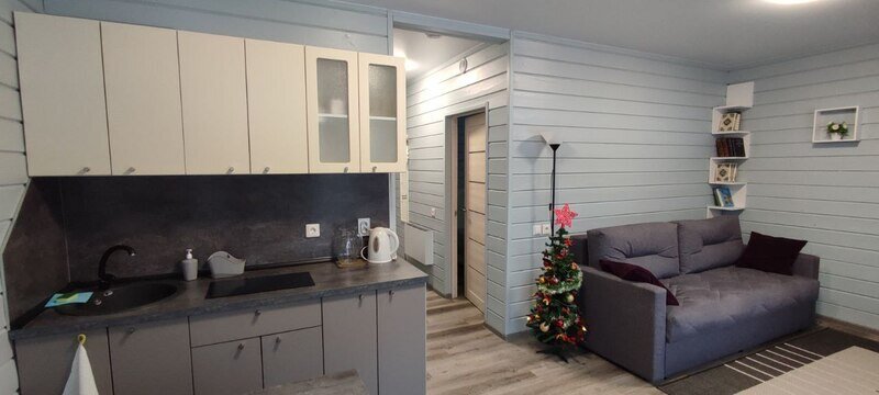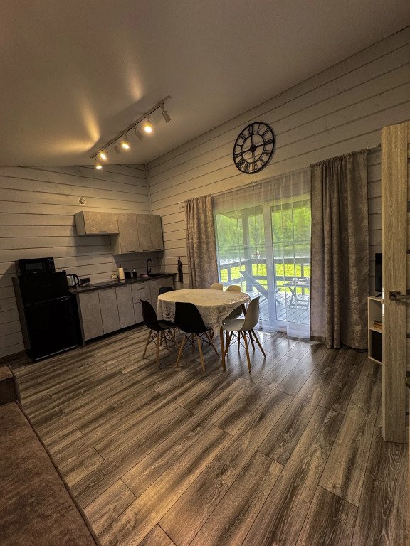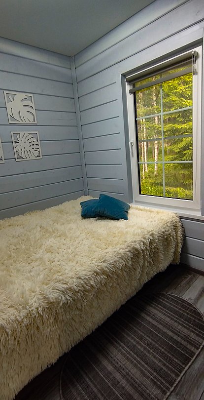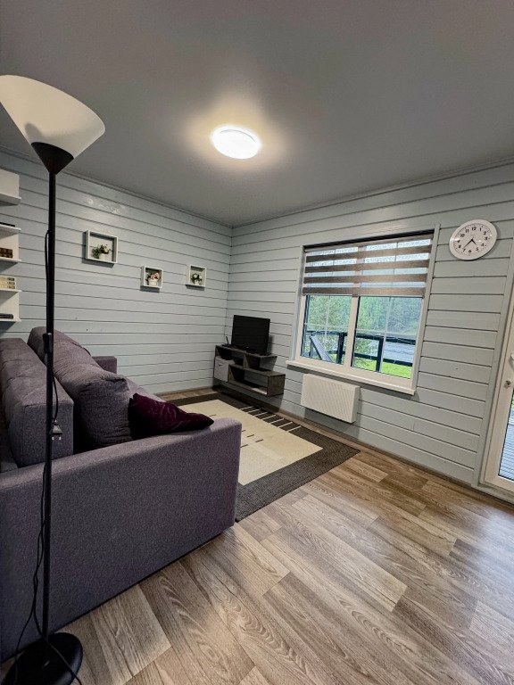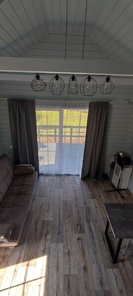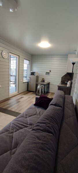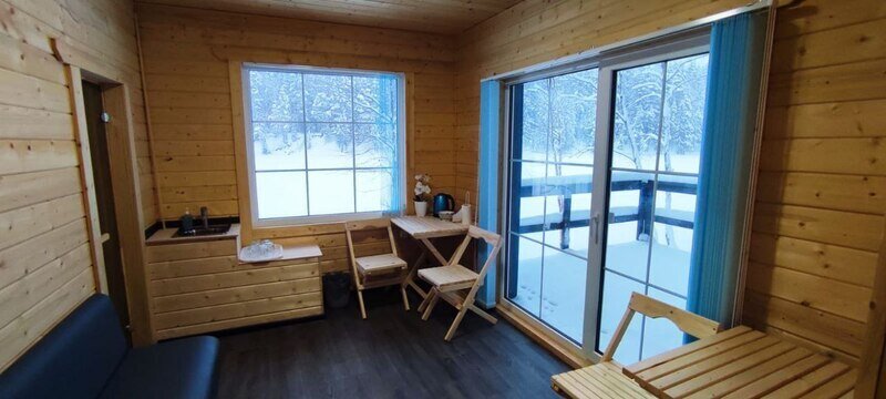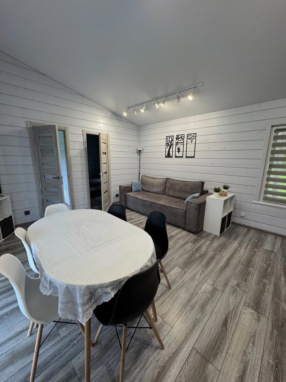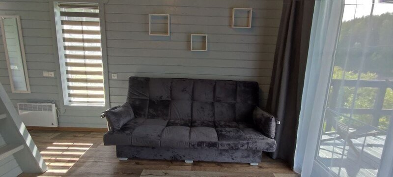 Тёплый, душевный домик №4 — идеальный вариант для семейного или парного отдыха: – 26 м² основного пространства + 8 м² мансардного этажа – размещение до 4 гостей – уютный диван-кровать – телевизор, Wi-Fi и сауна прямо в доме – панорамные окна и большая терраса с видом, который хочется фотографировать.