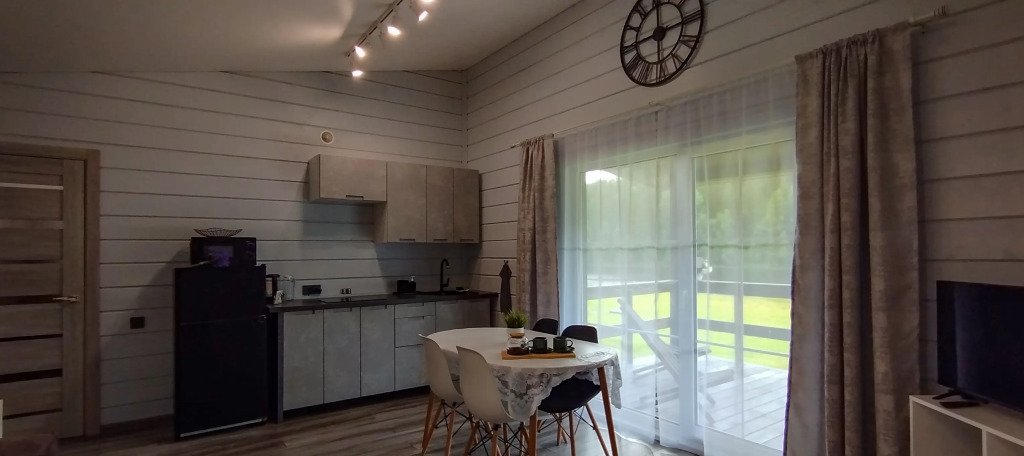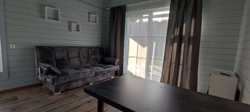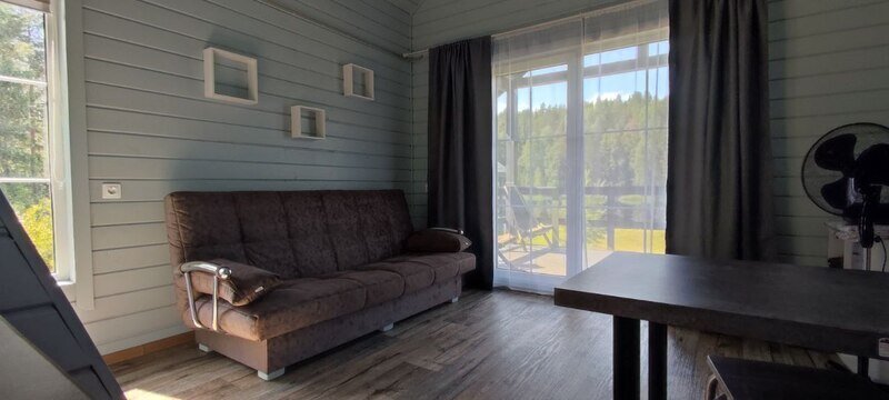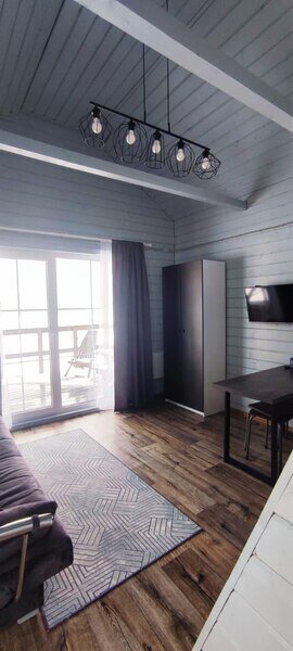 Тёплый, душевный домик №3 — идеальный вариант для семейного или парного отдыха: – 26 м² основного пространства + 8 м² мансардного этажа – размещение до 4 гостей – уютный диван-кровать – телевизор, Wi-Fi и сауна прямо в доме – панорамные окна и большая терраса с видом, который хочется фотографировать.