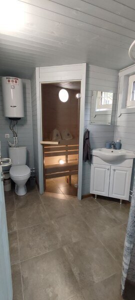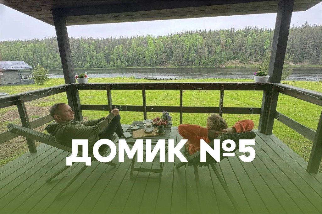 Самый вместительный и уютный Дом №5: – одноэтажный, 50 м², просторно и удобно, вмещает до 6 гостей, 2 отдельные спальни с двуспальными кроватями, диван-кровать в гостиной, обеденный стол для душевных бесед, телевизор, Wi-Fi и даже сауна прямо в доме!
