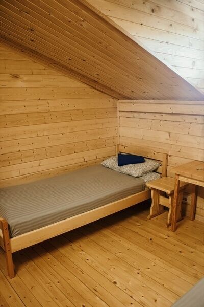2 кровати (одноместная и двухъярусная), санузел и душ рядом. В номере стол, два табурета, тумбочка, зеркало. Wi-fi, тёплый пол.