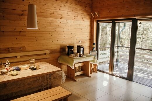 После парилки вы можете расслабиться в просторном каминном зале с выходом на террасу, где вы в полной мере ощутите чистейший аромат соснового бора.