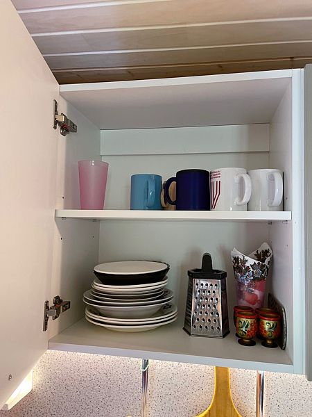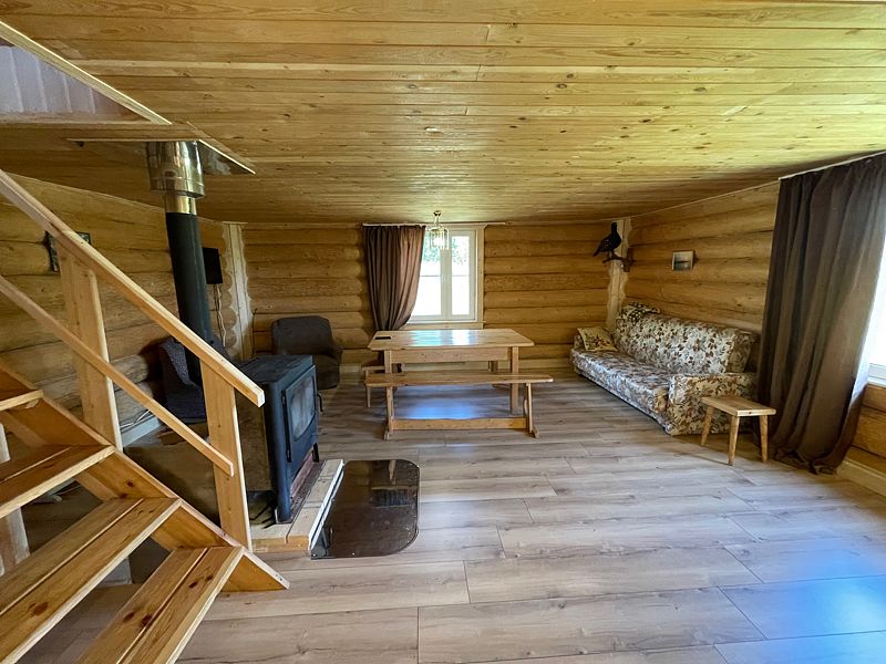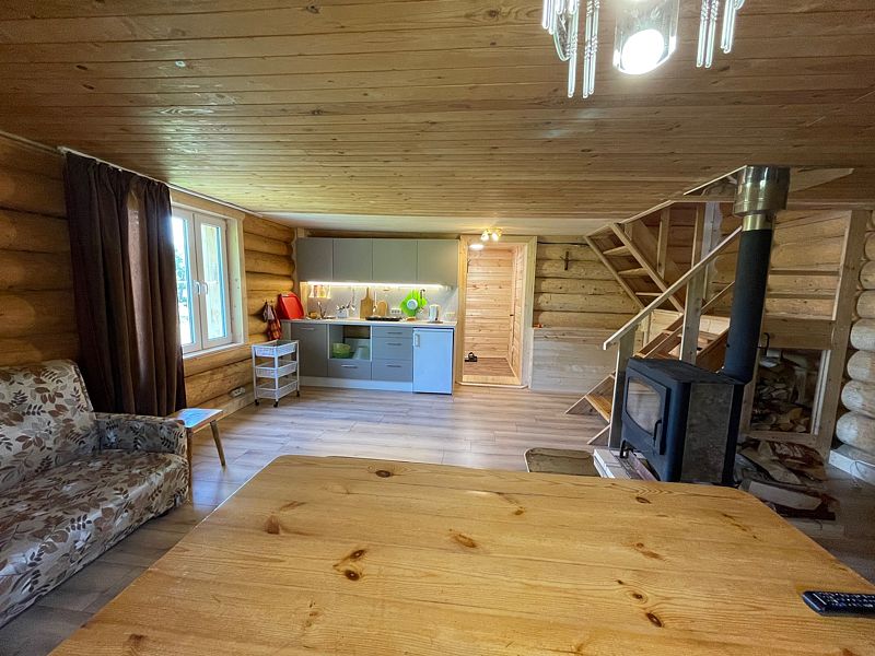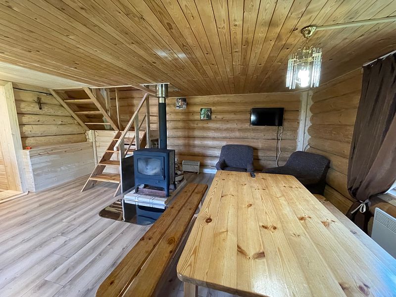 1 этаж: комната для умывания, душ, туалет; зал с диваном, креслами, телевизором, обеденным столом, печь или камин; кухня с газовой плитой и полным набором посуды.