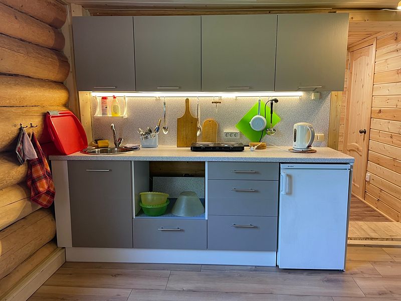 В коттедже: постельное бельё, полотенце, посуда, холодильник, телевизор, дрова. Все коттеджи благоустроены: есть тёплая вода, душ и туалет.
