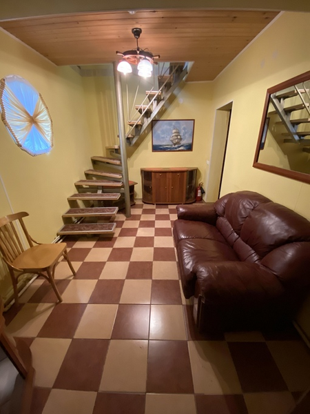 - Гостиная: камин, раскладной двуспальный диван, телевизор, тумбочка, стол, стулья, зеркало;
