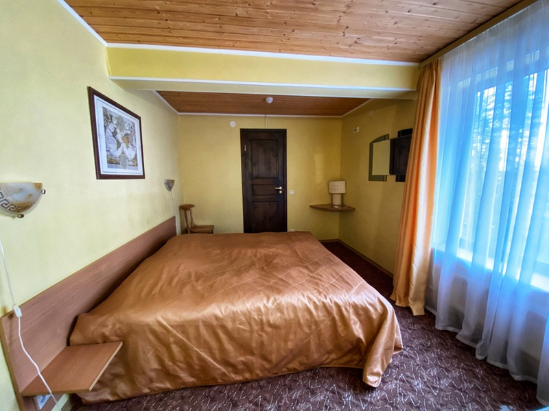 2 этаж: двуспальная кровать с двумя прикроватными полками, столик, стулья, зеркало. Туалет - душ, раковина, унитаз, пол с подогревом.