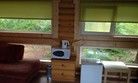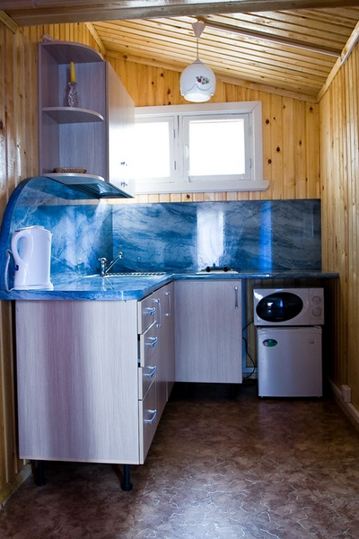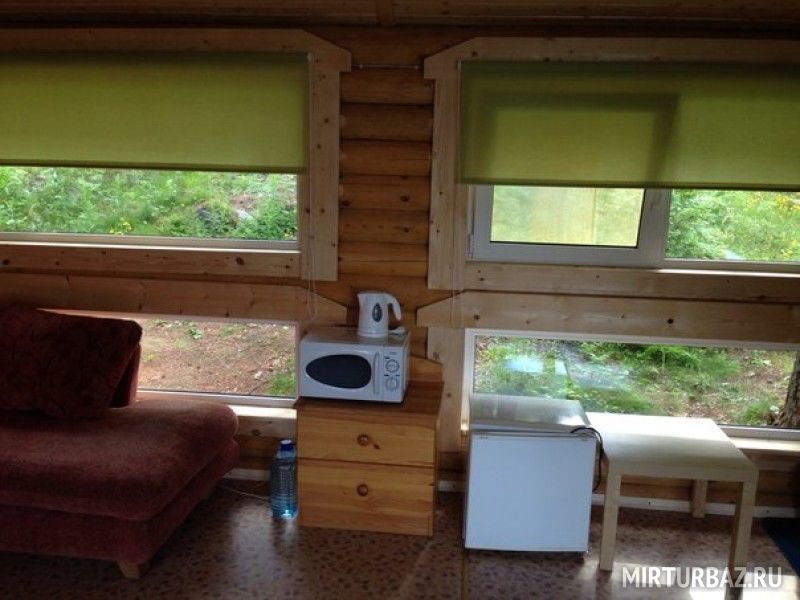 В домике два дивана, стол, телевизор, микроволновка, обогреватель, холодильник и чайник.