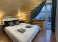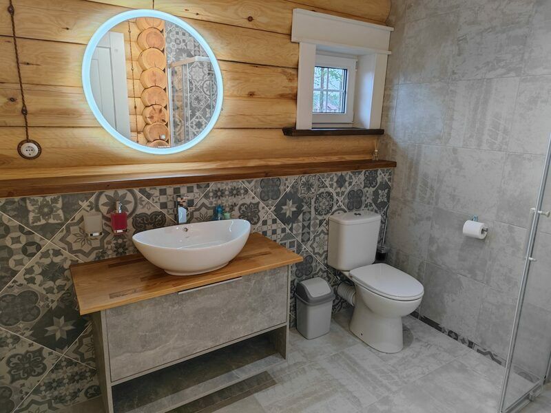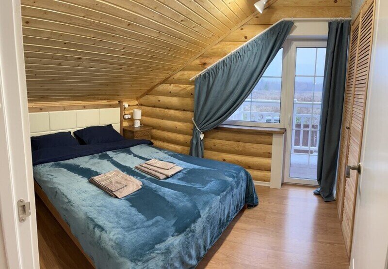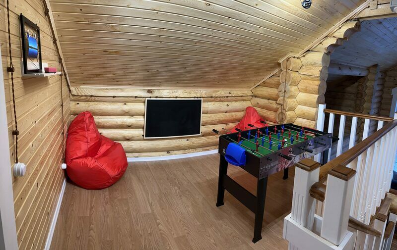 Второй этаж: две спальни с двуспальными кроватями, санузел, душевая кабина, игровой холл с настольными играми, выход с каждой спальни на балкон с видом на лес.