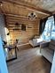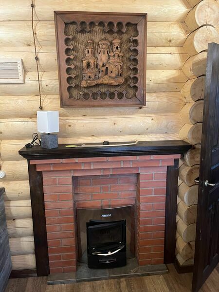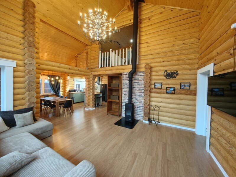 Первый этаж: каминный зал, кухня — столовая с современной бытовой техникой, камин дровяной, санузел, душевая кабина, две спальни, в каждой по две односпальные кровати, которые можно соединить в одну большую кровать, рабочий кабинет.