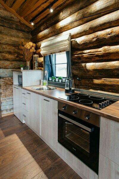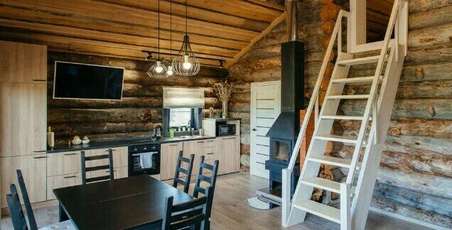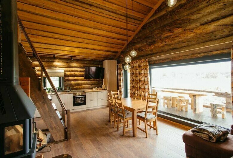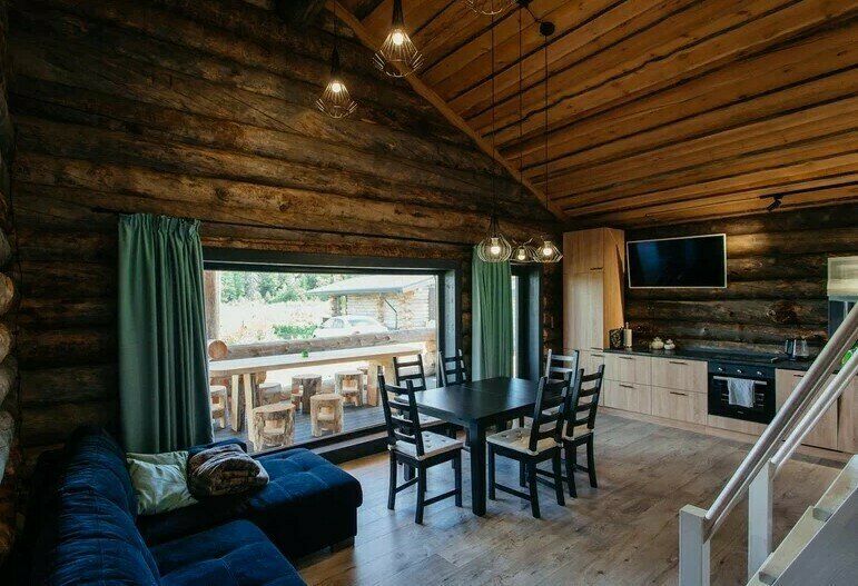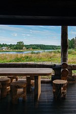 Баня построена из уникальной карельской сосны Кело с большими панорамными окнами и красивейшим видом на реку Шую.