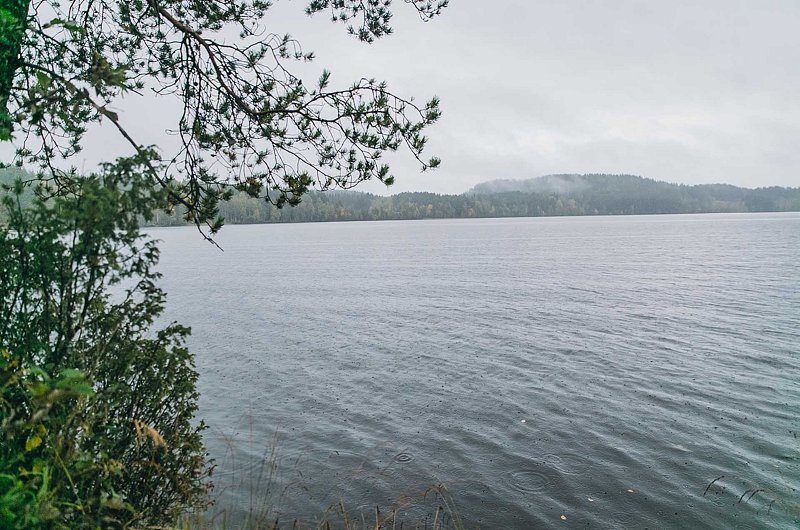 Одноэтажный деревянный домик на берегу Пряжинского озера.