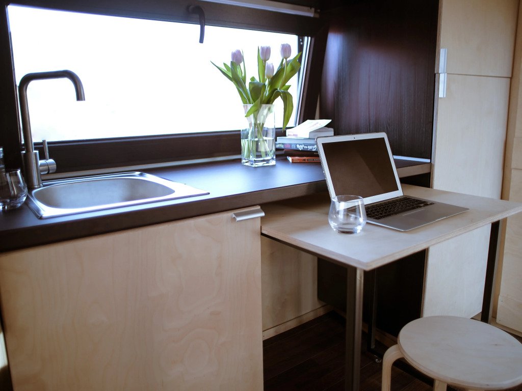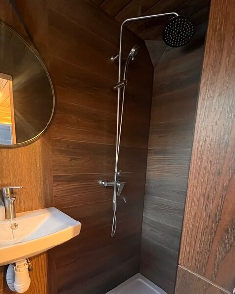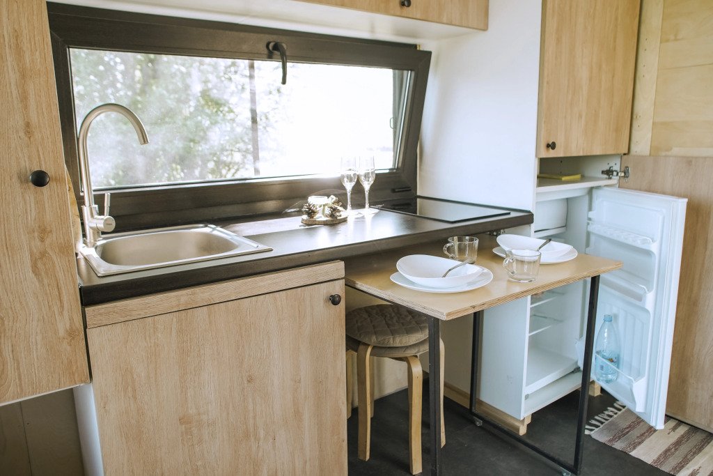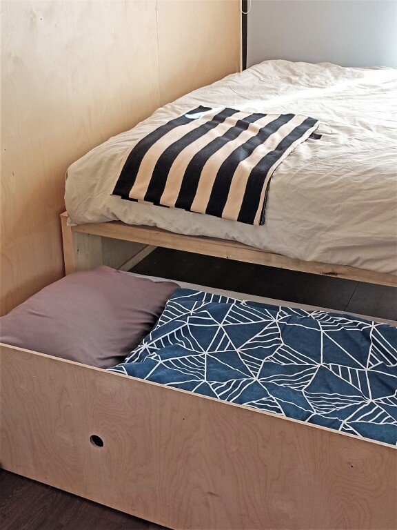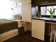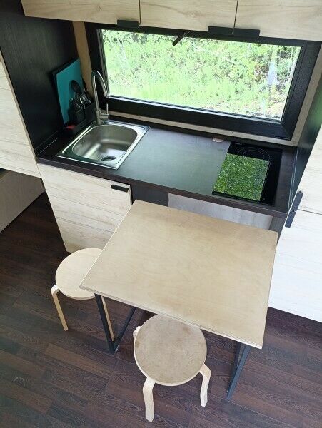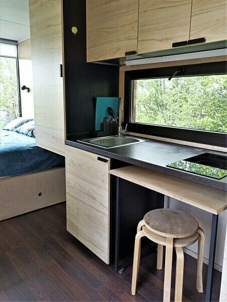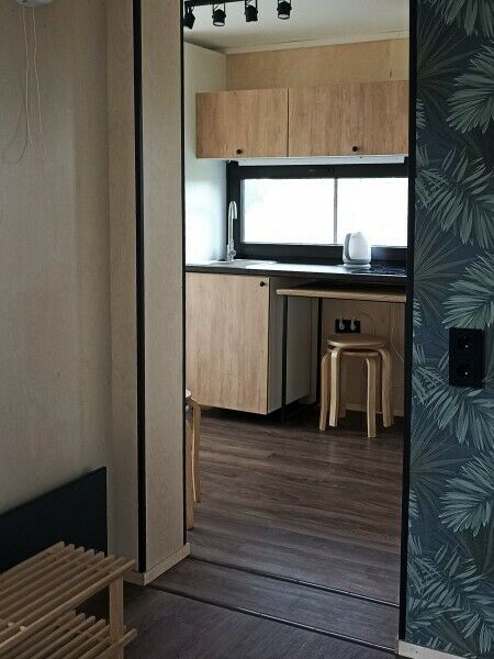 кровать дабл,доп. место 80*200 см,санузел с душем,кухня с посудой,холодильник, водонагреватель, электроплита, кухонная и столовая посуда, обеденный стол и стулья, шкаф для одежды, электрочайник