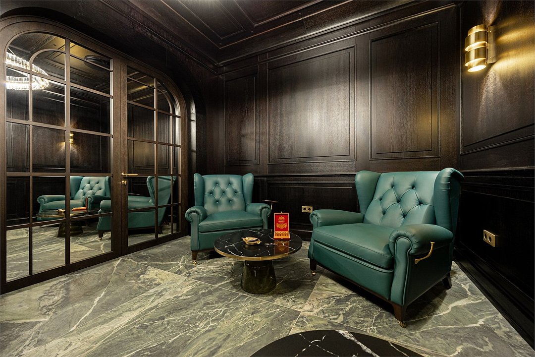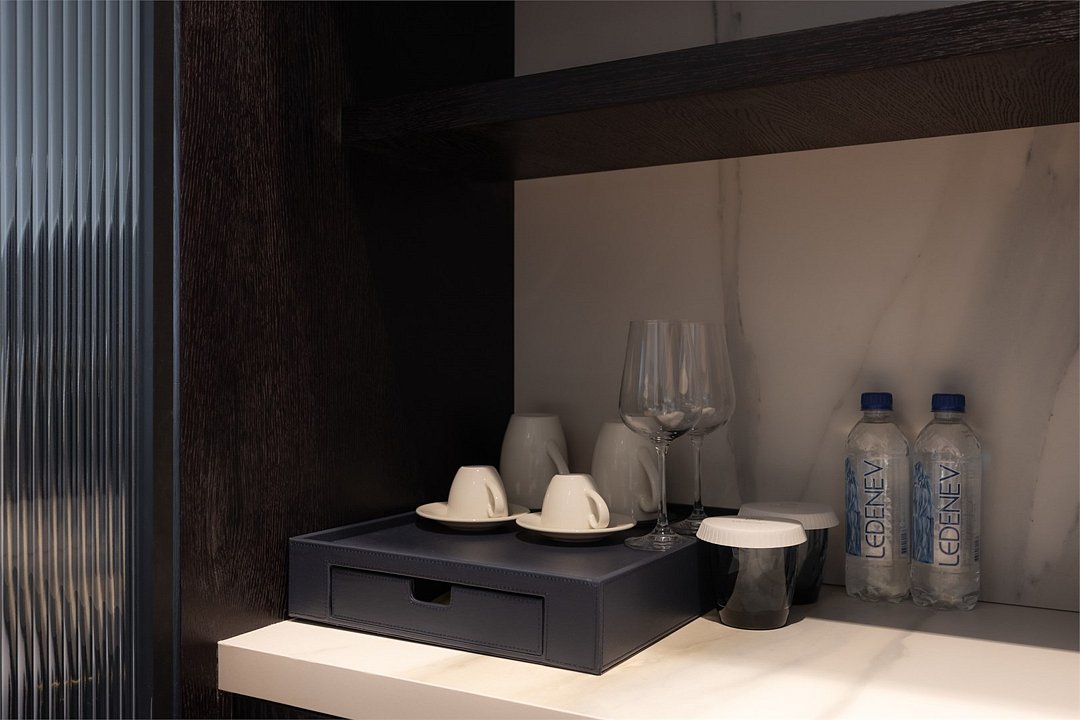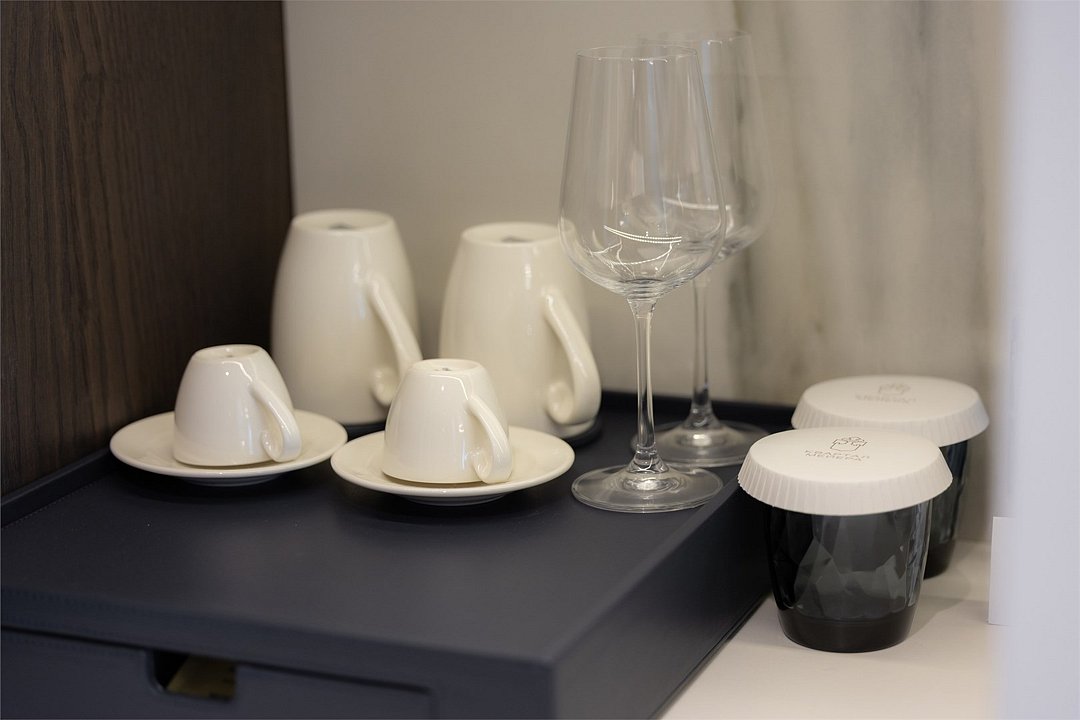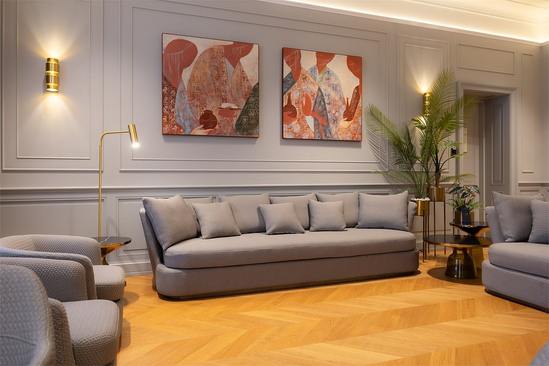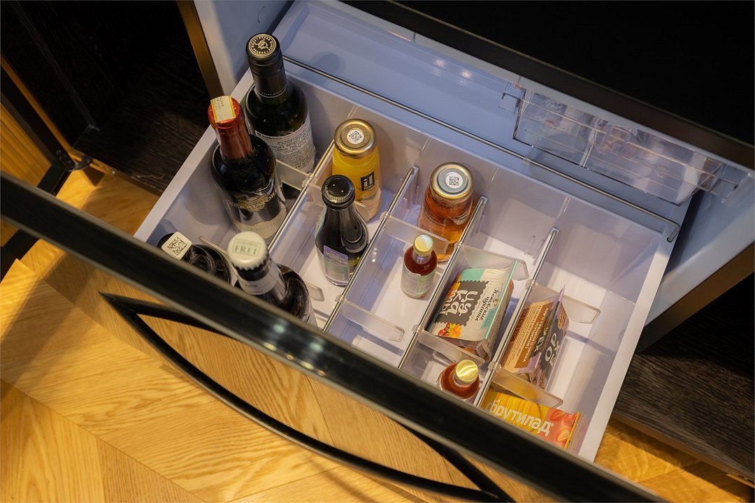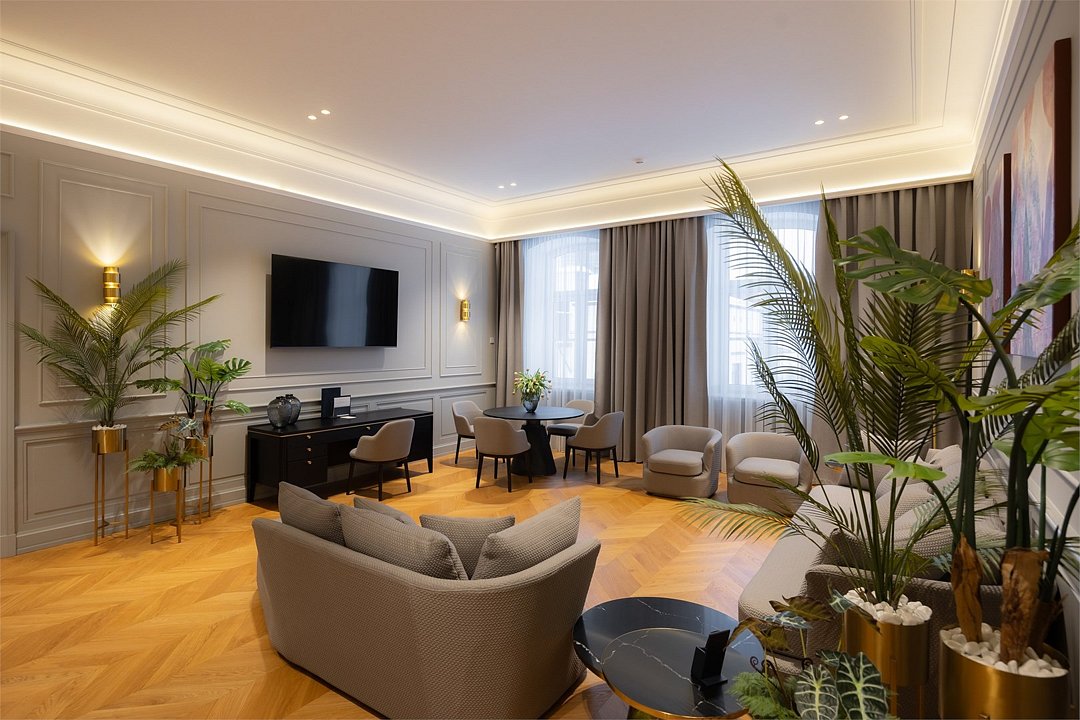 Wi-Fi, кондиционер, фен, кофемашина, халаты, банные полотенца, тапочки, косметические средства, кровать «King size», диван, кресла, тумбы, гардеробная, журнальный столик, письменный стол, ковер, сейф, душ, паркет, телевизор с плоским экраном, номер для некурящих, пуфик, система умный дом, чайная станция, двуспальный раскладной диван-кровать, затемняющая штора, без вида, без питомцевВ гостиничном номере
