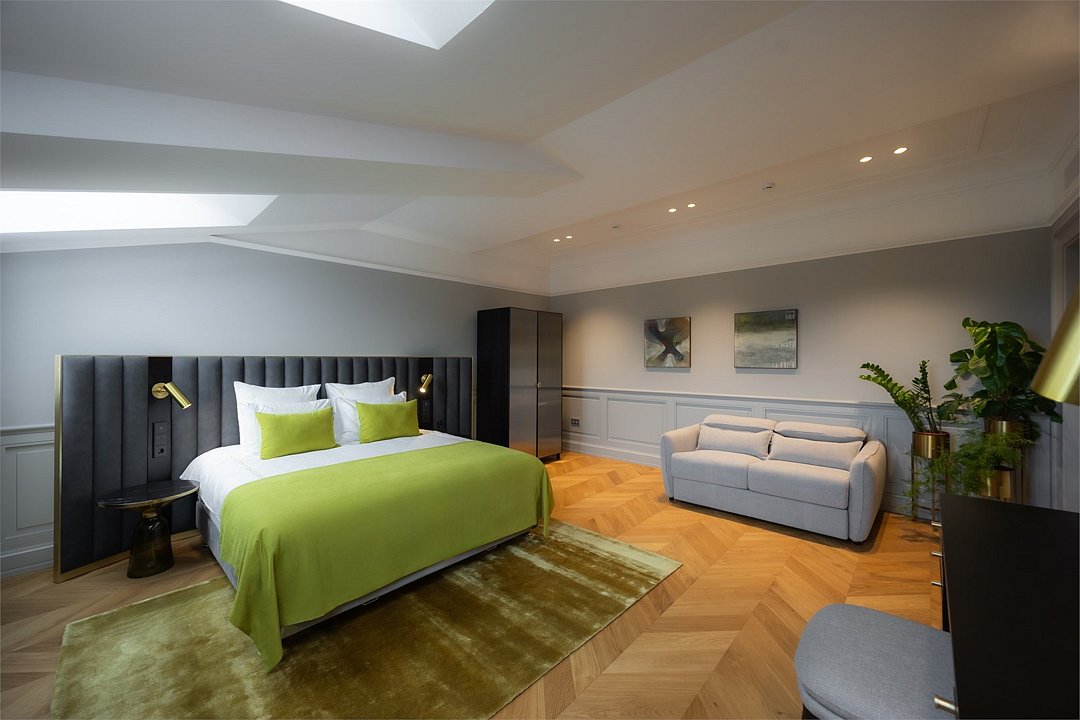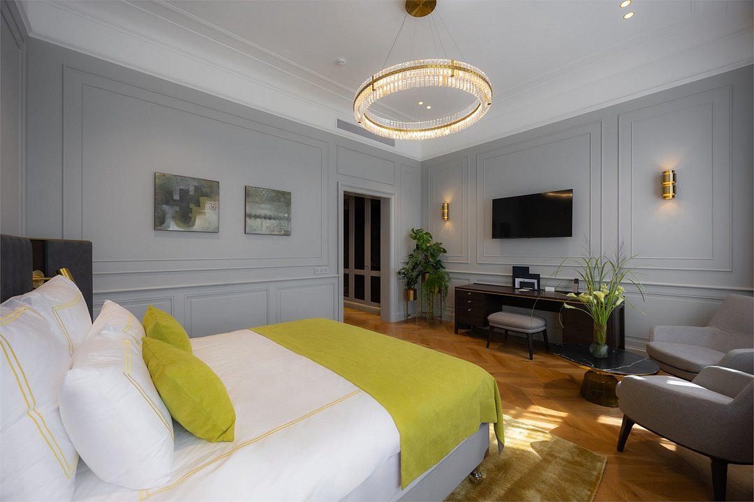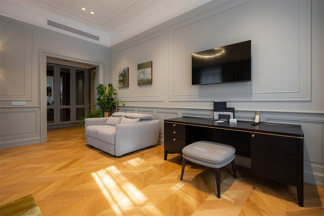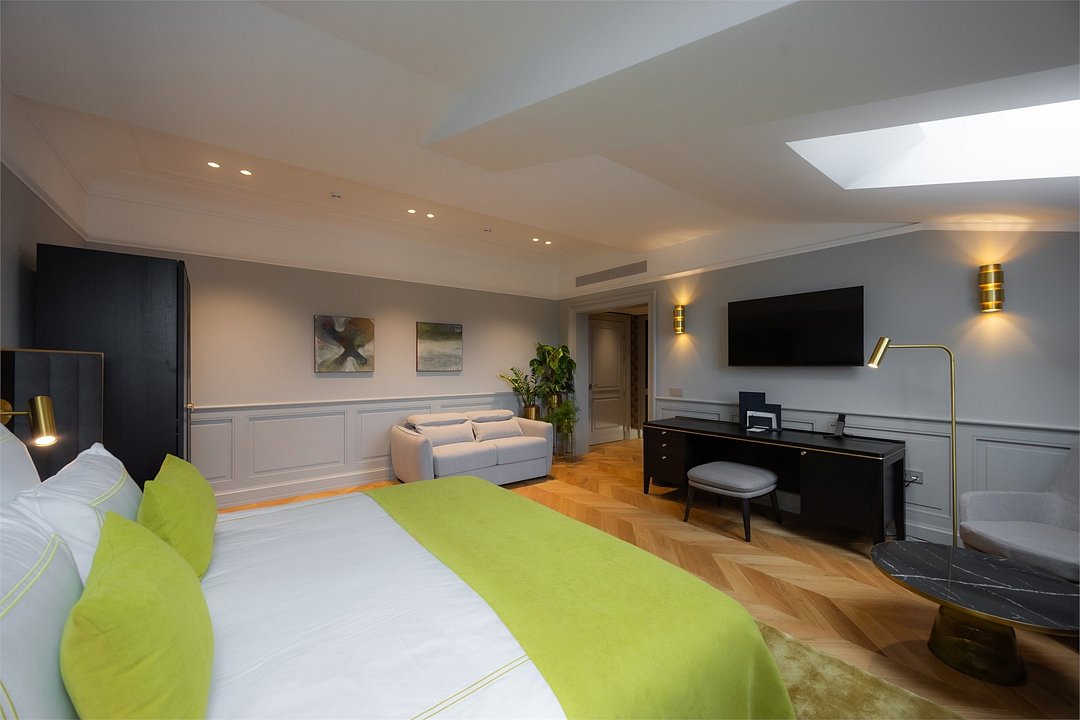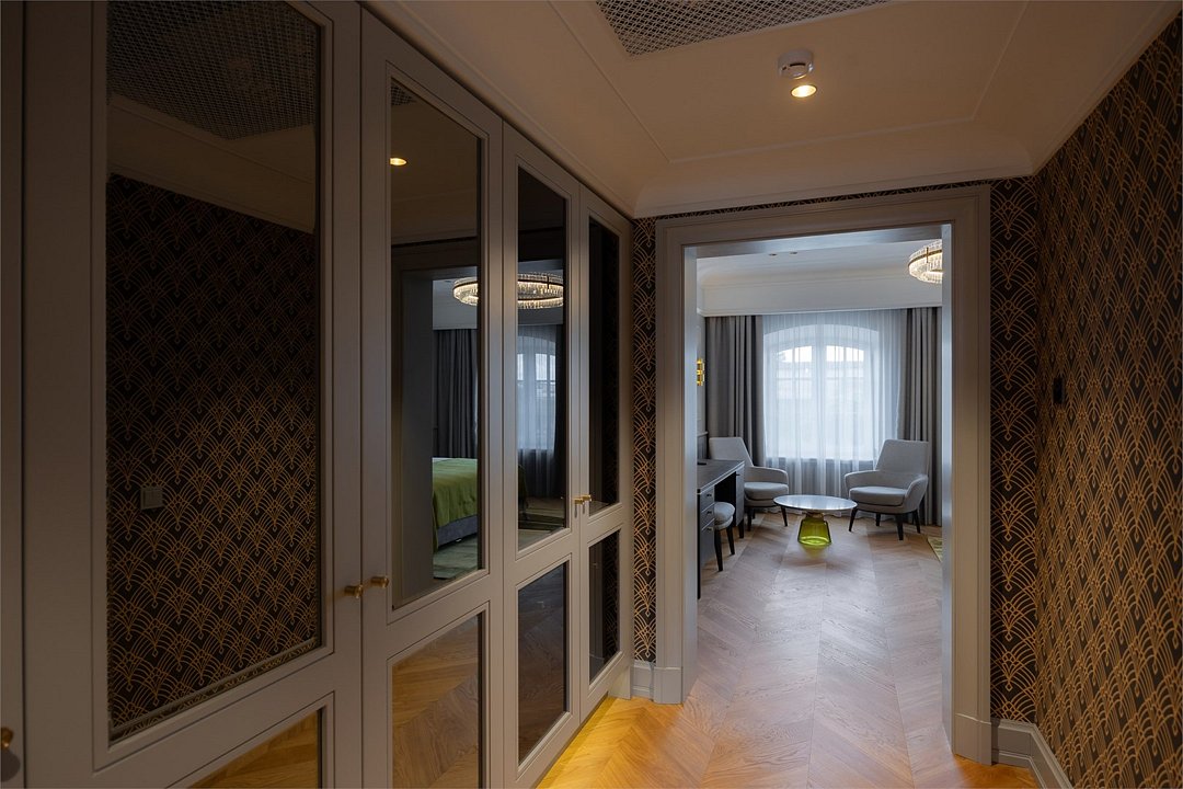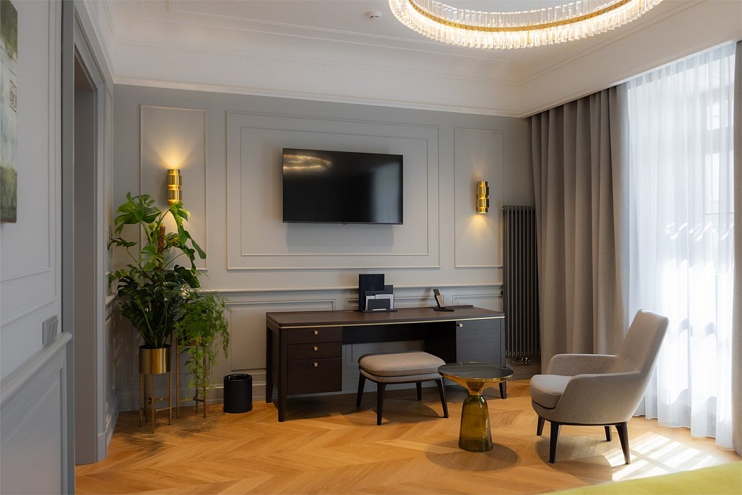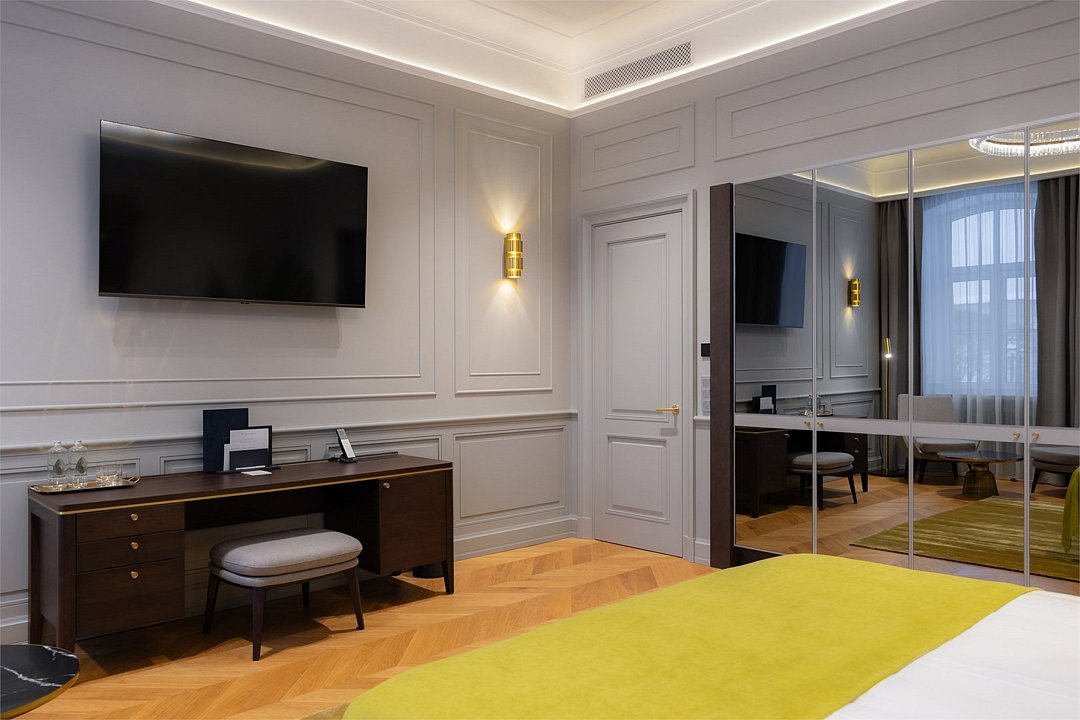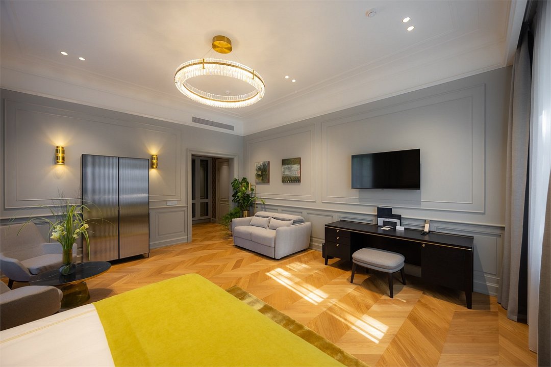 Wi-Fi, фен, кофемашина, биде, халаты, тапочки, косметические средства, кровать «King size», диван, гардеробная, письменный стол, мини-бар, сейф, душ, паркет, вид на парк, телевизор с плоским экраном, номер для некурящих, пуфик, система умный дом, чайная станция, затемняющая штора, без питомцевВ гостиничном номере