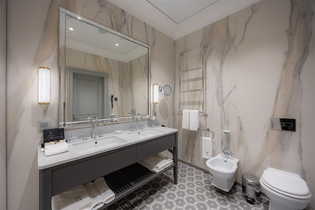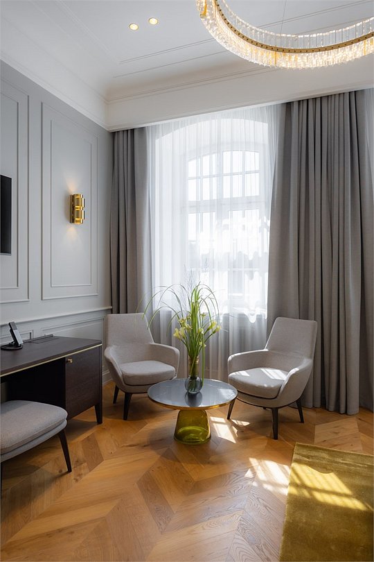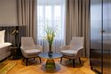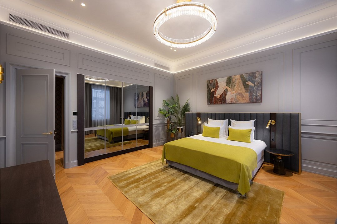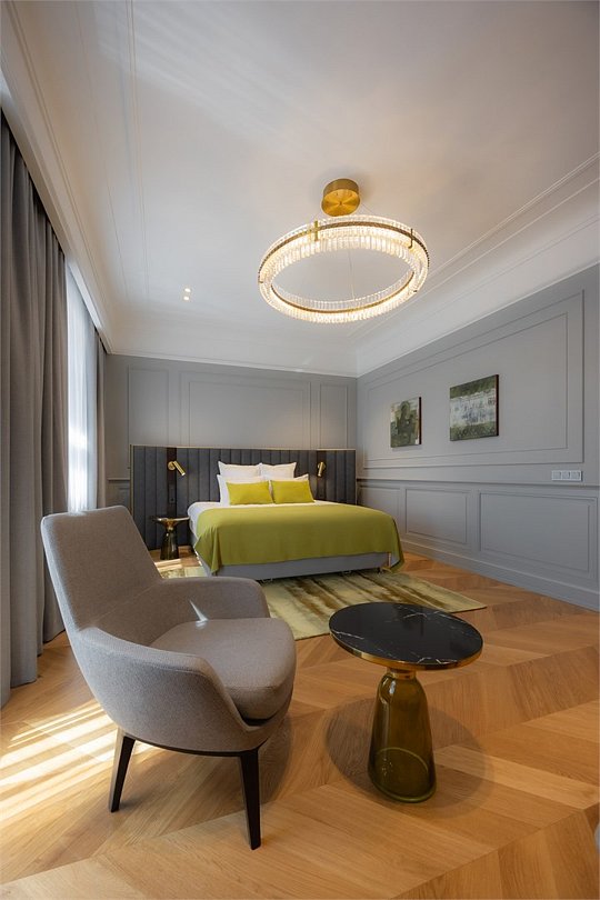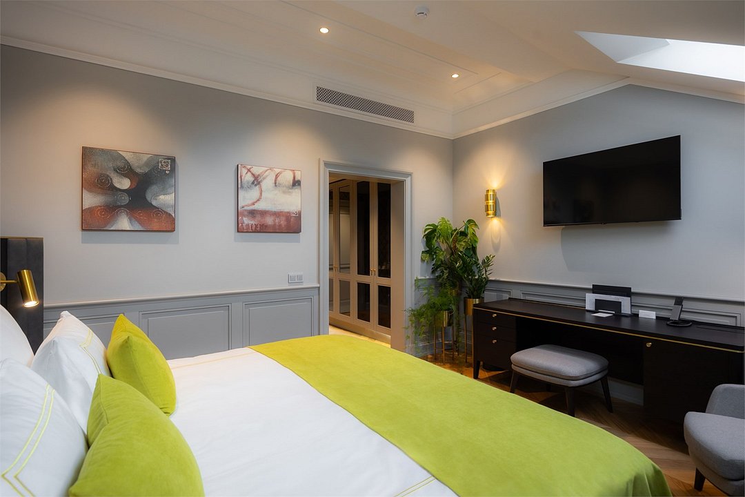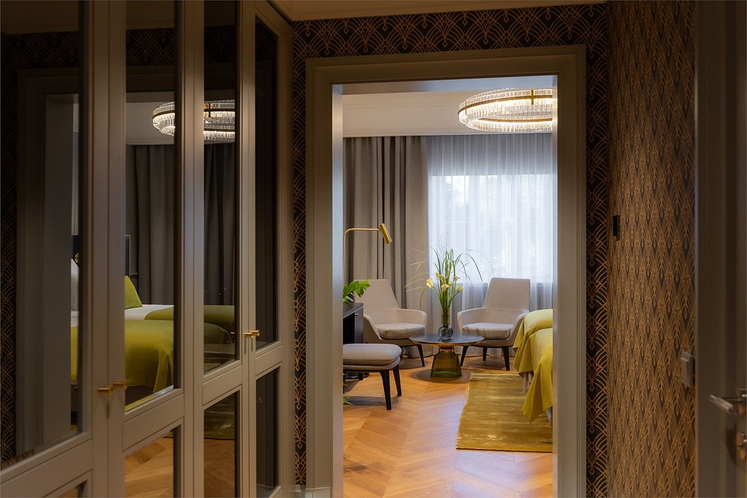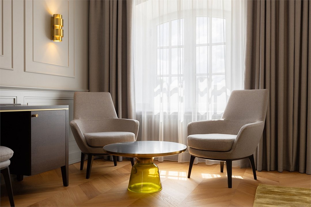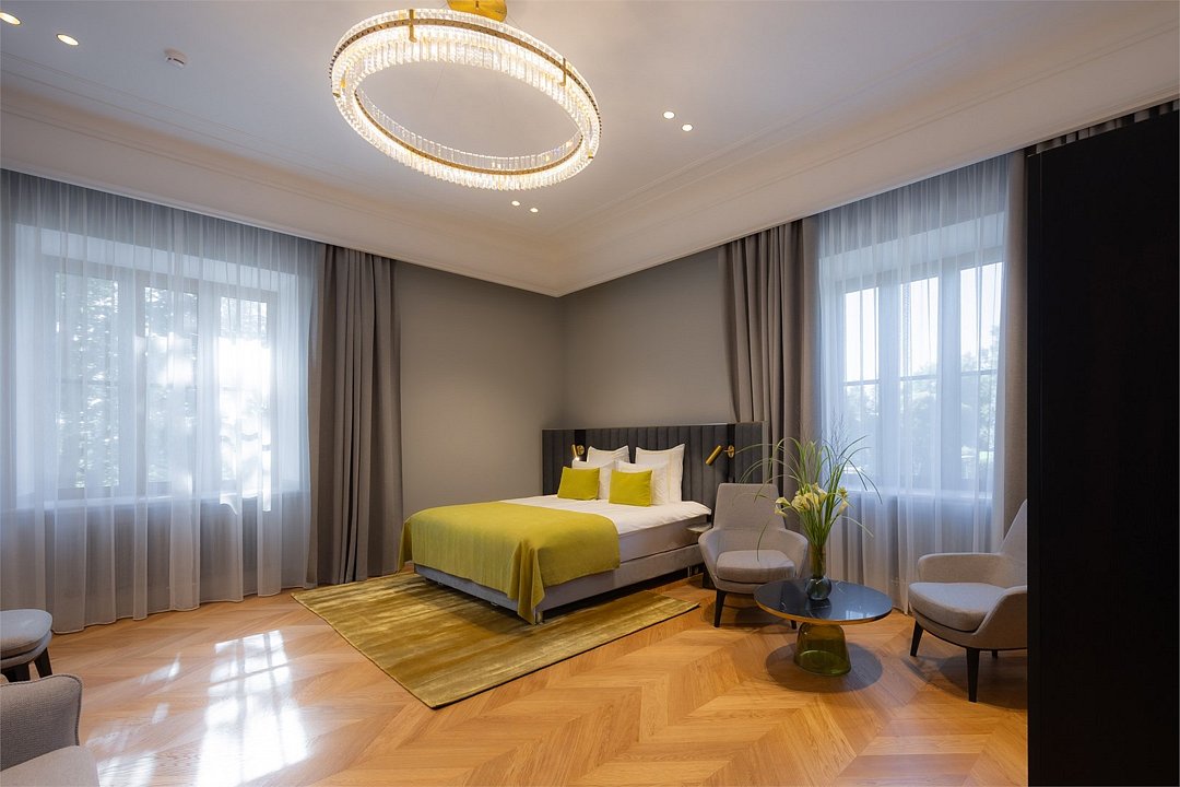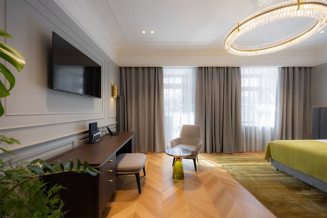 Wi-Fi, фен, кофемашина, биде, халаты, тапочки, косметические средства, кровать «King size», диван, гардеробная, письменный стол, мини-бар, сейф, душ, паркет, вид на парк, телевизор с плоским экраном, номер для некурящих, пуфик, система умный дом, чайная станция, затемняющая штора, без питомцевВ гостиничном номере