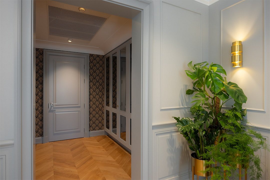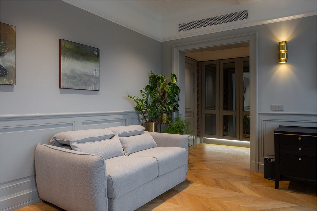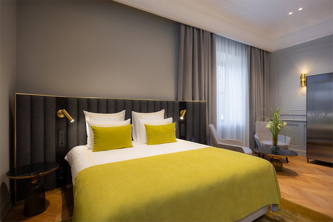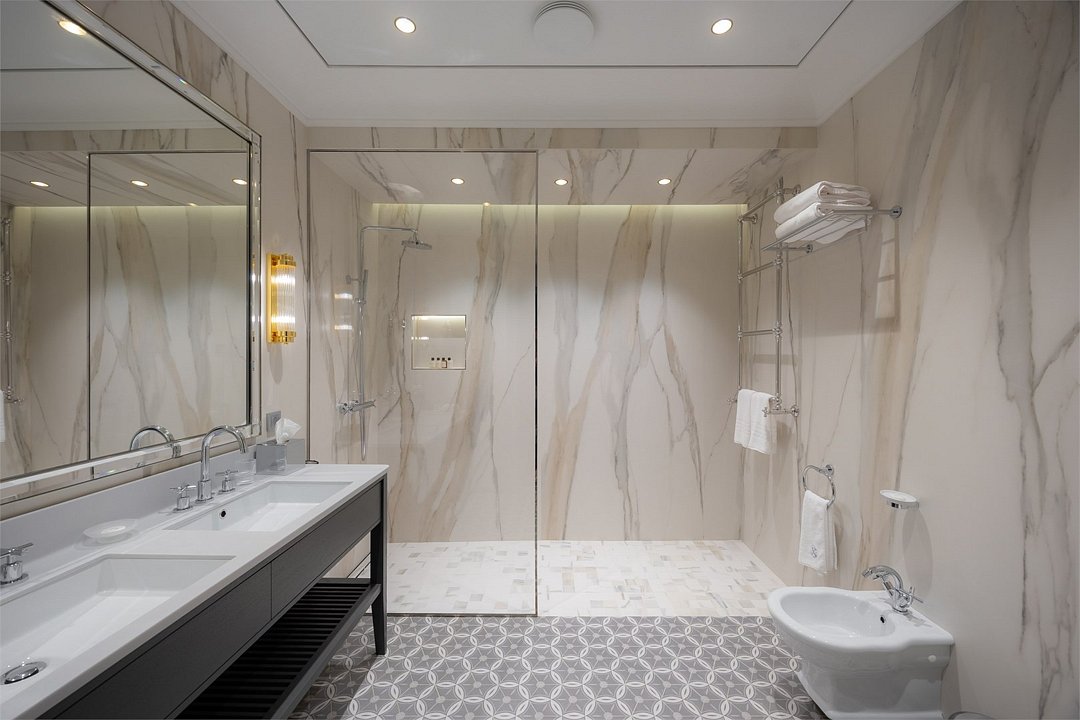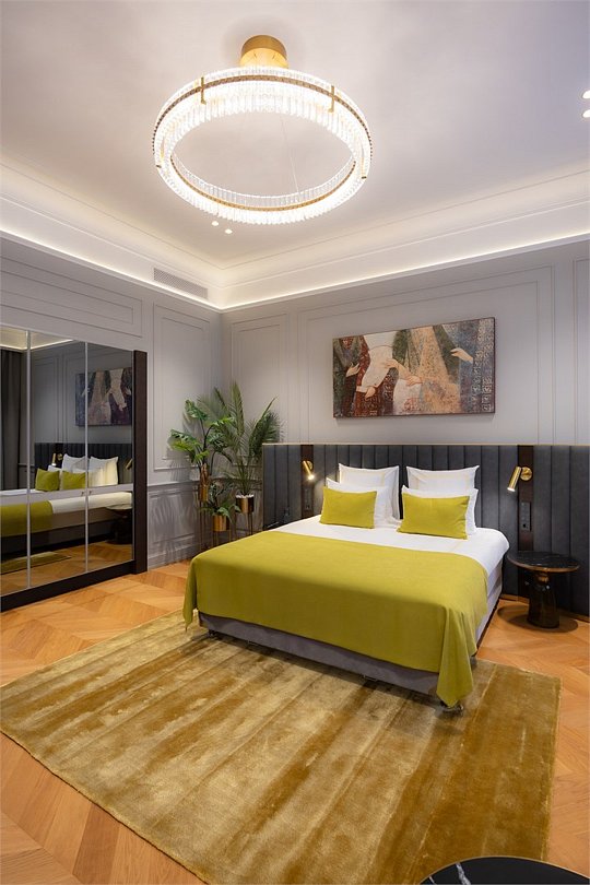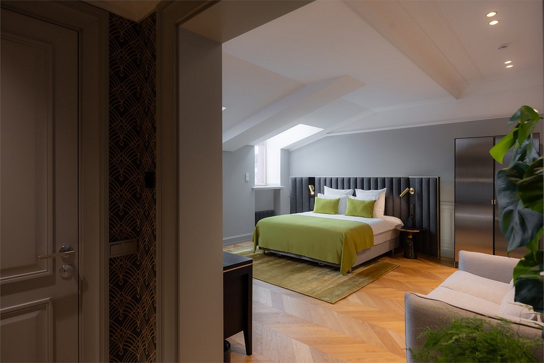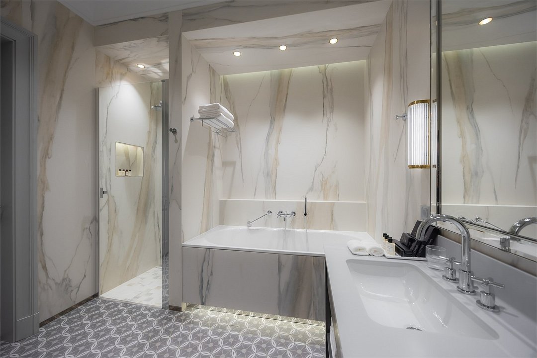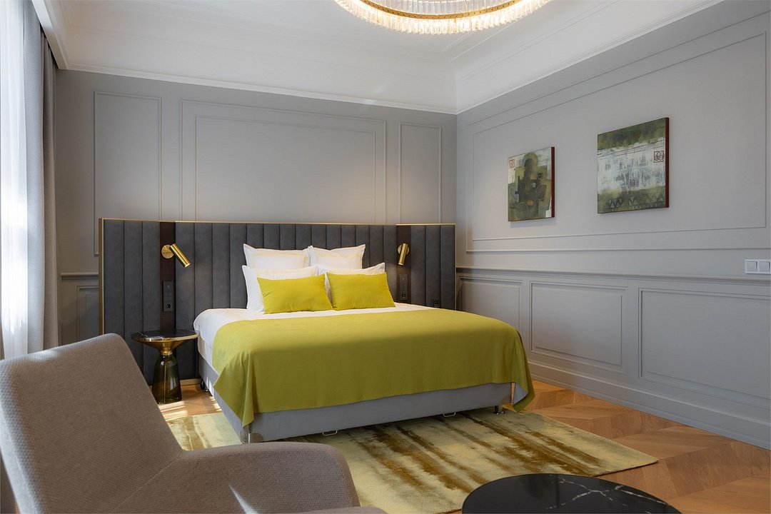 Wi-Fi, фен, кофемашина, биде, халаты, тапочки, косметические средства, кровать «King size», диван, гардеробная, письменный стол, мини-бар, сейф, душ, паркет, вид на парк, телевизор с плоским экраном, номер для некурящих, пуфик, система умный дом, чайная станция, затемняющая штора, без питомцевВ гостиничном номере